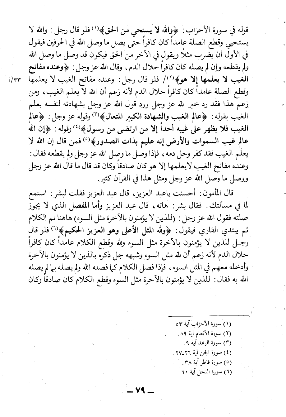 قوله في سورة الأحزاب: {وَاللَّهُ لا يَسْتَحْيِ مِنَ الْحَقّ} 1 فلو قال رجل: والله لا يستحي وقطع الصلة عامدا كان كافرا حتى يصل ما وصل الله في الحرفين فيقول في الأول أن يضرب مثلا ويقول في الآخر من الحق فيكون قد وصل ما وصل الله ولم يقطعه وإن لم يصله كان كافرا حلال الدم، وقال الله عز وجل: {وَعِنْدَهُ مَفَاتِحُ الْغَيْبِ لا يَعْلَمُهَا إِلاّ هُو} 2 (33/أ) فلو قال رجل: وعنده مفاتح الغيب لا يعلمها وقطع الصلة عامدا كان كافرا حلال الدم لأنه زعم أن الله لا يعلم الغيب، ومن زعم هذا فقد رد خبر الله عز وجل ورد قول الله عز وجل بشهادته لنفسه بعلم الغيب بقوله: {عَالِمُ الْغَيْبِ وَالشَّهَادَةِ الْكَبِيرُ الْمُتَعَالِ} 3 وقوله عز وجل: {عَالِمُ الْغَيْبِ فَلا يُظْهِرُ عَلَى غَيْبِهِ أَحَداً إِلاّ مَنِ ارْتَضَى مِنْ رَسُولٍ} 4 وقوله: {إِنَّ اللَّهَ عَالِمُ غَيْبِ السَّمَاوَاتِ وَالأَرْضِ إِنَّهُ عَلِيمٌ بِذَاتِ الصُّدُورِ} 5 فمن قال إن الله لا يعلم الغيب فقد كفر وحل دمه، فإذا وصل ما وصل الله عزوجل ولم يقطعه فقال: "وعنده مفاتح الغيب لا يعلمها إلا هو كان صادقا وكان قد قال ما قال الله عز وجل ووصل ما وصل الله عزوجل ومثل هذا في القرآن كثير".