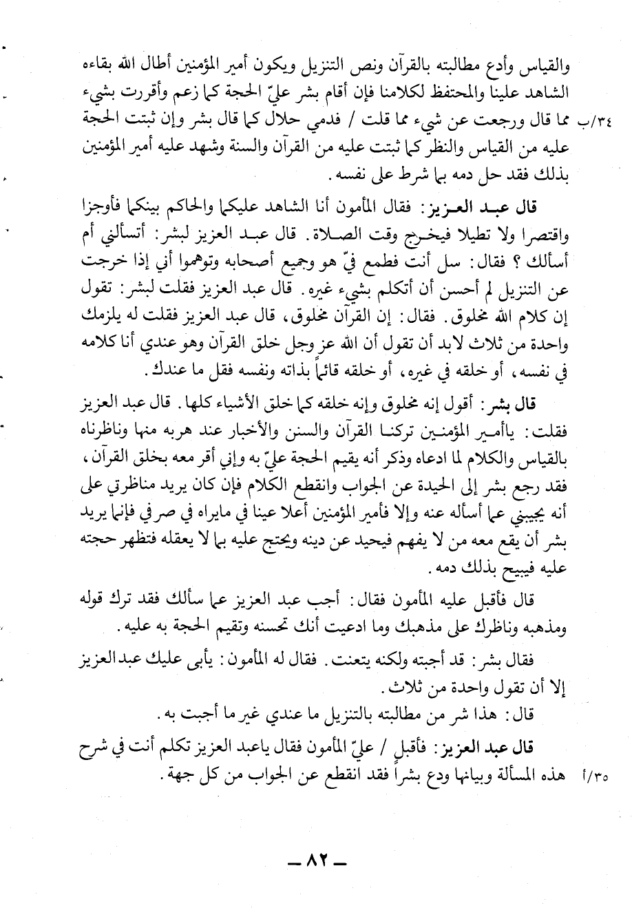 قال عبد العزيز: "فأقبل (35/أ) علي المأمون فقال يا عبد العزيز تكلم أنت في شرح هذه المسألة وبيانها ودع بشرا فقد انقطع عن الجواب من كل جهة.