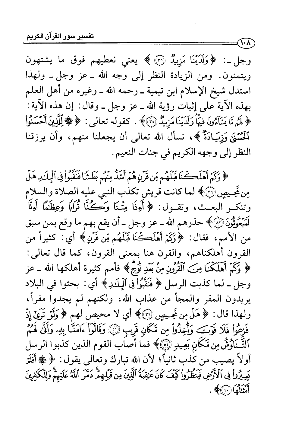 وجل -: {ولدينا مزيد} يعني نعطيهم فوق ما يشتهون ويتمنون. ومن الزيادة النظر إلى وجه الله - عز وجل - ولهذا استدل شيخ الإسلام ابن تيمية - رحمه الله - وغيره من أهل العلم بهذه الآية على إثبات رؤية الله - عز وجل - وقال: إن هذه الآية: {لهم ما يشاءون فيها ولدينا مزيد} . كقوله تعالى: {للذين أحسنوا الحسنى وزيادة} ، نسأل الله تعالى أن يجعلنا منهم، وأن يرزقنا النظر إلى وجهه الكريم في جنات النعيم.