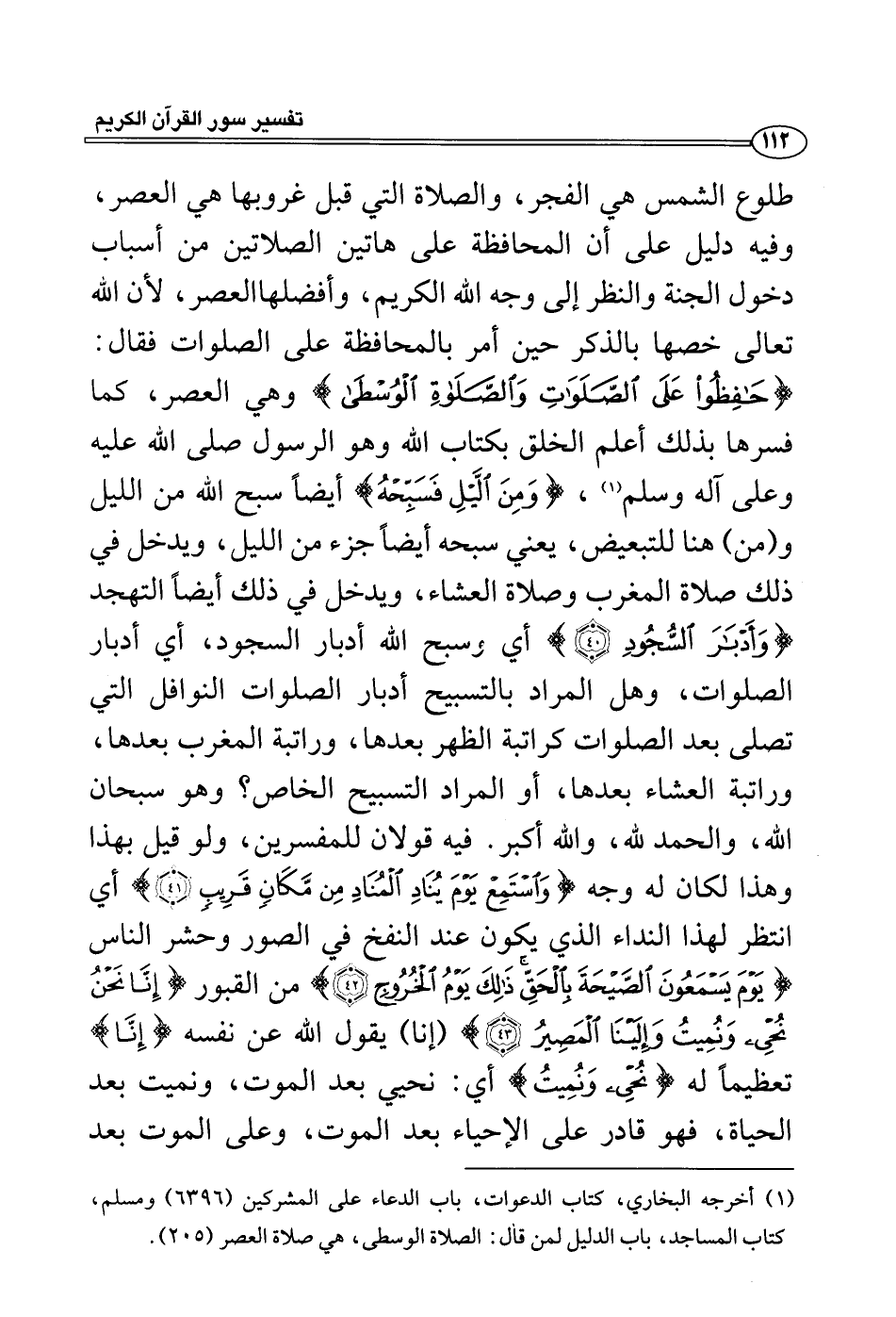 {ومن الليل فسبحه} أيضاً سبح الله من الليل و (من) هنا للتبعيض، يعني سبحه أيضاً جزء من الليل، ويدخل في ذلك صلاة المغرب وصلاة العشاء، ويدخل في ذلك أيضاً التهجد {وأدبر السجود} أي وسبح الله أدبار السجود، أي أدبار الصلوات، وهل المراد بالتسبيح أدبار الصلوات النوافل التي تصلى بعد الصلوات كراتبة الظهر بعدها، وراتبة المغرب بعدها، وراتبة العشاء بعدها، أو المراد التسبيح الخاص؟ وهو سبحان الله، والحمد لله، والله أكبر.