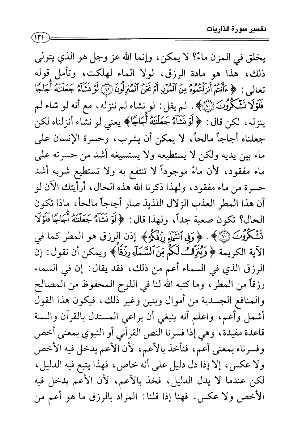 يخلق في المزن ماءً؟ لا يمكن، وإنما الله عز وجل هو الذي يتولى ذلك، هذا هو مادة الرزق، لولا الماء لهلكت، وتأمل قوله تعالى: {أءنتم أنزلتموه من المزن أم نحن المنزلون لو نشاء جعلناه أجاجاً فلولا تشكرون} . لم يقل: لو نشاء لم ننزله، مع أنه لو شاء لم ينزله، لكن قال: {لو نشاء جعلناه أجاجاً} يعني لو نشاء أنزلناه لكن جعلناه أجاجاً مالحاً، لا يمكن أن يشرب، وحسرة الإنسان على ماء بين يديه ولكن لا يستطيعه ولا يستسيغه أشد من حسرته على ماء مفقود، لأن ماءً موجوداً لا تنتفع به ولا تستطيع شربه أشد حسرة من ماء مفقود، ولهذا ذكرنا الله هذه الحال، أرأيتك الآن لو أن هذا المطر العذب الزلال اللذيذ صار أجاجاً مالحاً، ماذا تكون الحال؟ تكون صعبة جداً، ولهذا قال: {لو نشاء جعلناه أجاجاً فلولا تشكرون} .