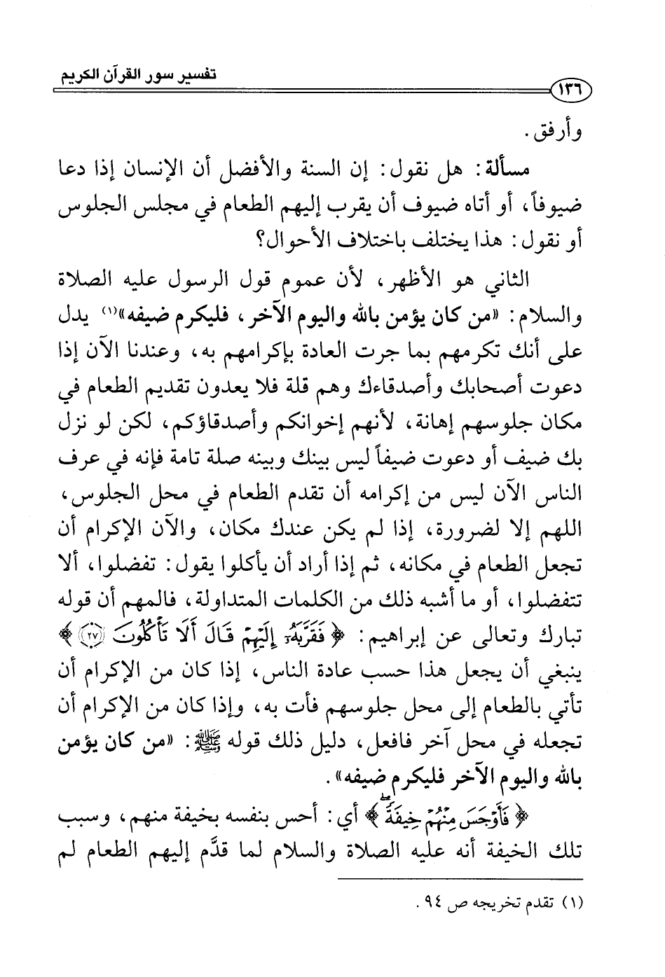 الثاني هو الأظهر، لأن عموم قول الرسول عليه الصلاة والسلام: «من كان يؤمن بالله واليوم الآخر، فليكرم ضيفه» (¬1) يدل على أنك تكرمهم بما جرت العادة بإكرامهم به، وعندنا الآن إذا دعوت أصحابك وأصدقاءك وهم قلة فلا يعدون تقديم الطعام في مكان جلوسهم إهانة، لأنهم إخوانكم وأصدقاؤكم، لكن لو نزل بك ضيف أو دعوت ضيفاً ليس بينك وبينه صلة تامة فإنه في عرف الناس الآن ليس من إكرامه أن تقدم الطعام في محل الجلوس، اللهم إلا لضرورة، إذا لم يكن عندك مكان، والآن الإكرام أن تجعل الطعام في مكانه، ثم إذا أراد أن يأكلوا يقول: تفضلوا، ألا تتفضلوا، أو ما أشبه ذلك من الكلمات المتداولة، فالمهم أن قوله تبارك وتعالى عن إبراهيم: {فقربه إليهم قال ألا تأكلون} ينبغي أن يجعل هذا حسب عادة الناس، إذا كان من الإكرام أن تأتي بالطعام إلى محل جلوسهم فأت به، وإذا كان من الإكرام أن تجعله في محل آخر فافعل، دليل ذلك قوله صلى الله عليه وسلم: «من كان يؤمن بالله واليوم الآخر فليكرم ضيفه» .