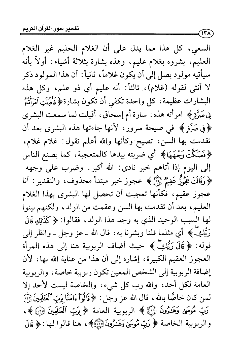 أولاً بأنه سيأتيه مولود يصل إلى أن يكون غلاماً، ثانياً: أن هذا المولود ذكر لا أنثى لقوله (غلام) ، ثالثاً: أنه عليم أي ذو علم، وكل هذه البشارات عظيمة، كل واحدة تكفي أن تكون بشارة {فأقبلت امرأته في صرة} امرأته هذه: سارة أم إسحاق، أقبلت لما سمعت البشرى {في صرة} في صيحة سرور، لأنها جاءتها هذه البشرى بعد أن تقدمت بها السن، تصيح وكأنها والله أعلم تقول: غلام غلام، {فصكت وجهها} أي ضربته بيدها كالمتعجبة، كما يصنع الناس إلى اليوم إذا أتاهم خبر نادى: الله أكبر.