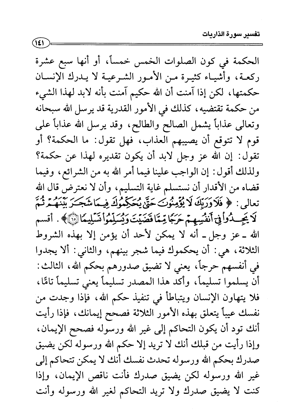 أقسم الله - عز وجل - أنه لا يمكن لأحد أن يؤمن إلا بهذه الشروط الثلاثة، هي: أن يحكموك فيما شجر بينهم، والثاني: ألا يجدوا في أنفسهم حرجاً، يعني لا تضيق صدورهم بحكم الله، الثالث: أن يسلموا تسليماً، وأكد هذا المصدر تسليماً يعني تسليماً تامًّا، فلا يتهاون الإنسان ويتباطأ في تنفيذ حكم الله، فإذا وجدت من نفسك عيباً يتعلق بهذه الأمور الثلاثة فصحح إيمانك، فإذا رأيت أنك تود أن يكون التحاكم إلى غير الله ورسوله فصحح الإيمان، وإذا رأيت من قبلك أنك لا تريد إلا حكم الله ورسوله لكن يضيق صدرك بحكم الله ورسوله تحدث نفسك أنك لا يمكن تتحاكم إلى غير الله ورسوله لكن يضيق صدرك فأنت ناقص الإيمان، وإذا كنت لا يضيق صدرك ولا تريد التحاكم لغير الله ورسوله وأنت