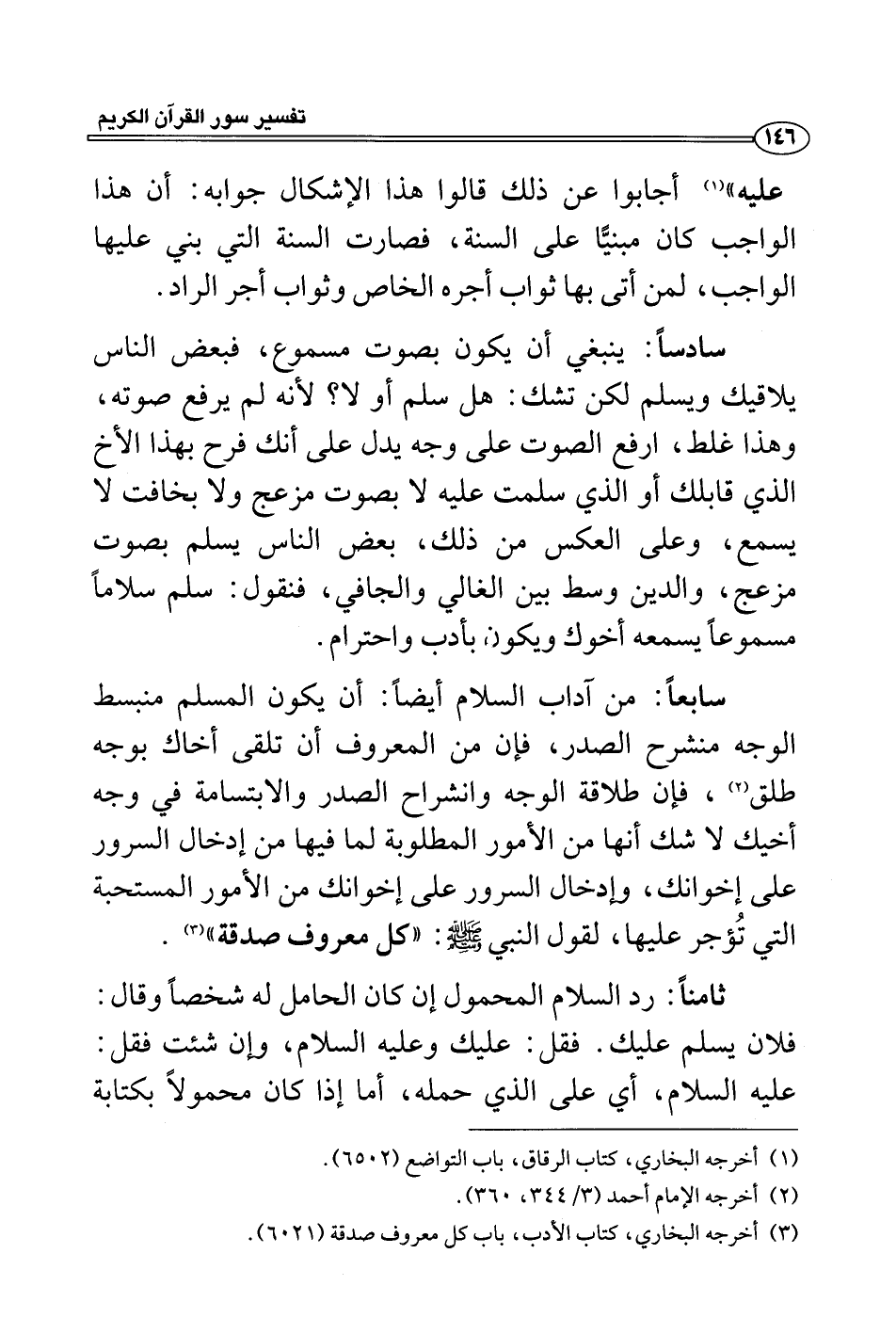 سادساً: ينبغي أن يكون بصوت مسموع، فبعض الناس يلاقيك ويسلم لكن تشك: هل سلم أو لا؟ لأنه لم يرفع صوته، وهذا غلط، ارفع الصوت على وجه يدل على أنك فرح بهذا الأخ الذي قابلك أو الذي سلمت عليه لا بصوت مزعج ولا بخافت لا يسمع، وعلى العكس من ذلك، بعض الناس يسلم بصوت مزعج، والدين وسط بين الغالي والجافي، فنقول: سلم سلاماً مسموعاً يسمعه أخوك ويكون بأدب واحترام.