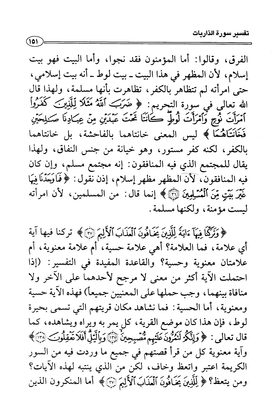 الفرق، وقالوا: أما المؤمنون فقد نجوا، وأما البيت فهو بيت إسلام، لأن المظهر في هذا البيت - بيت لوط - أنه بيت إسلامي، حتى امرأته لم تتظاهر بالكفر، تظاهرت بأنها مسلمة، ولهذا قال الله تعالى في سورة التحريم: {ضرب الله مثلاً للذين كفروا امرأت نوح وامرأت لوط كانتا تحت عبدين من عبادنا صالحين فخانتاهما} ليس المعنى خانتاهما بالفاحشة، بل خانتاهما بالكفر، لكنه كفر مستور، وهو خيانة من جنس النفاق، ولهذا يقال للمجتمع الذي فيه المنافقون: إنه مجتمع مسلم، وإن كان فيه المنافقون، لأن المظهر مظهر إسلام، إذن نقول: {فما وجدنا فيها غير بيت من المسلمين} إنما قال: من المسلمين، لأن امرأته ليست مؤمنة، ولكنها مسلمة.