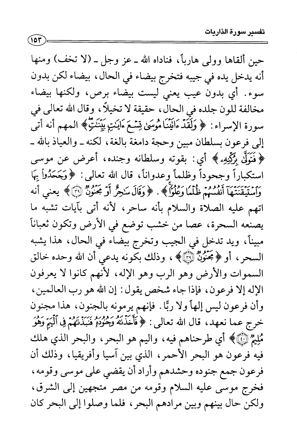 أي بدون عيب يعني ليست بيضاء برص، ولكنها بيضاء مخالفة للون جلده في الحال، حقيقة لا تخيلاً، وقال الله تعالى في سورة الإسراء: {ولقد ءاتينا موسى تسع ءايات بينات} المهم أنه أتى إلى فرعون بسلطان مبين وحجة دامغة بالغة، لكنه - والعياذ بالله - {فتولى بركنه} أي: بقوته وسلطانه وجنده، أعرض عن موسى استكباراً وجحوداً وظلماً وعدواناً، قال الله تعالى: {وجحدوا بها واستيقنتهآ أنفسهم ظلماً وعلواً} . {وقال ساحر أو مجنون} يعني أنه اتهم عليه الصلاة والسلام بأنه ساحر، لأنه أتى بآيات تشبه ما يصنعه السحرة، عصا من خشب توضع في الأرض وتكون ثعباناً مبيناً، ويد تدخل في الجيب وتخرج بيضاء في الحال، هذا يشبه السحر، أو {مجنون} ، وذلك بكونه يدعي أن الله وحده خالق السموات والأرض وهو الرب وهو الإله، لأنهم كانوا لا يعرفون الإله إلا فرعون، فإذا جاء شخص يقول: إن الله هو رب العالمين، وأن فرعون ليس إلهاً ولا ربًّا. فإنهم يرمونه بالجنون، هذا مجنون خرج عما نعهد، قال الله تعالى: {فأخذناه وجنوده فنبذناهم في اليم وهو مليم} أي طرحناهم فيه، واليم هو البحر، والبحر الذي هلك فيه فرعون هو البحر الأحمر، الذي بين آسيا وأفريقيا، وذلك أن فرعون جمع جنوده وحشدهم وأراد أن يقضي على موسى وقومه، فخرج موسى عليه السلام وقومه من مصر متجهين إلى الشرق، ولكن حال بينهم وبين مرادهم البحر، فلما وصلوا إلى البحر كان