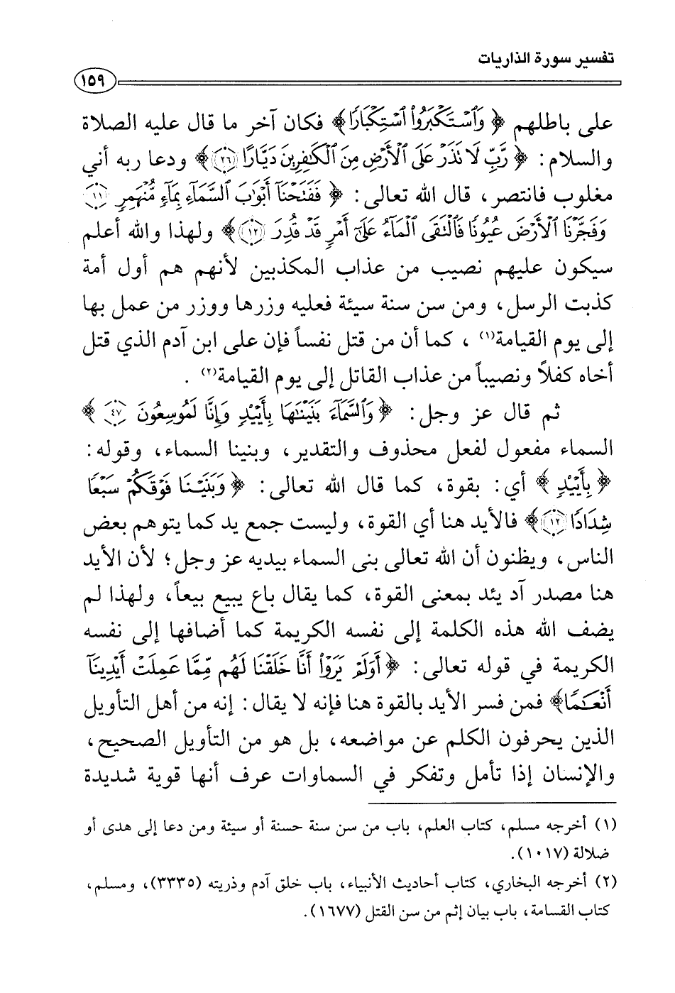 ثم قال عز وجل: {والسماء بنينها بأيد وإنا لموسعون} السماء مفعول لفعل محذوف والتقدير، وبنينا السماء، وقوله: {بأيد} أي: بقوة، كما قال الله تعالى: {وبنينا فوقكم سبعاً شداداً} فالأيد هنا أي القوة، وليست جمع يد كما يتوهم بعض الناس، ويظنون أن الله تعالى بنى السماء بيديه عز وجل؛ لأن الأيد هنا مصدر آد يئد بمعنى القوة، كما يقال باع يبيع بيعاً، ولهذا لم يضف الله هذه الكلمة إلى نفسه الكريمة كما أضافها إلى نفسه الكريمة في قوله تعالى: {أولم يروا أنا خلقنا لهم مما عملت أيدينآ أنعماً} فمن فسر الأيد بالقوة هنا فإنه لا يقال: إنه من أهل التأويل الذين يحرفون الكلم عن مواضعه، بل هو من التأويل الصحيح، والإنسان إذا تأمل وتفكر في السماوات عرف أنها قوية شديدة