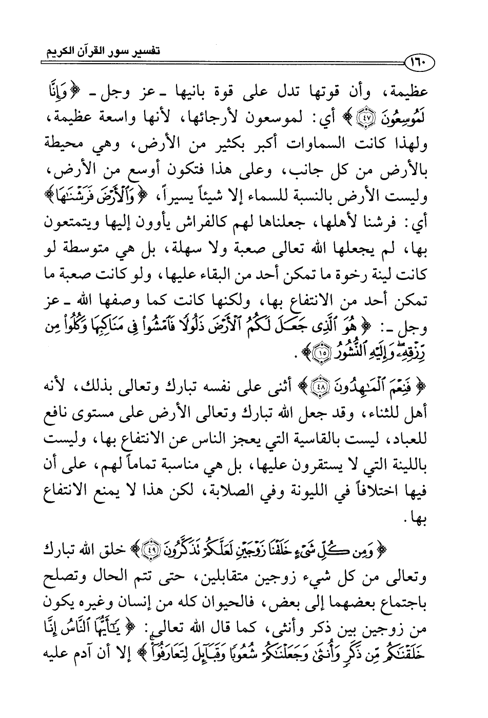 عظيمة، وأن قوتها تدل على قوة بانيها - عز وجل - {وإنا لموسعون} أي: لموسعون لأرجائها، لأنها واسعة عظيمة، ولهذا كانت السماوات أكبر بكثير من الأرض، وهي محيطة بالأرض من كل جانب، وعلى هذا فتكون أوسع من الأرض، وليست الأرض بالنسبة للسماء إلا شيئاً يسيراً، {والأَرض فرشنها} أي: فرشنا لأهلها، جعلناها لهم كالفراش يأوون إليها ويتمتعون بها، لم يجعلها الله تعالى صعبة ولا سهلة، بل هي متوسطة لو كانت لينة رخوة ما تمكن أحد من البقاء عليها، ولو كانت صعبة ما تمكن أحد من الانتفاع بها، ولكنها كانت كما وصفها الله - عز وجل -: {هو الذي جعل لكم الأَرض ذلولاً فامشوا في مناكبها وكلوا من رزقه وإليه النشور} .