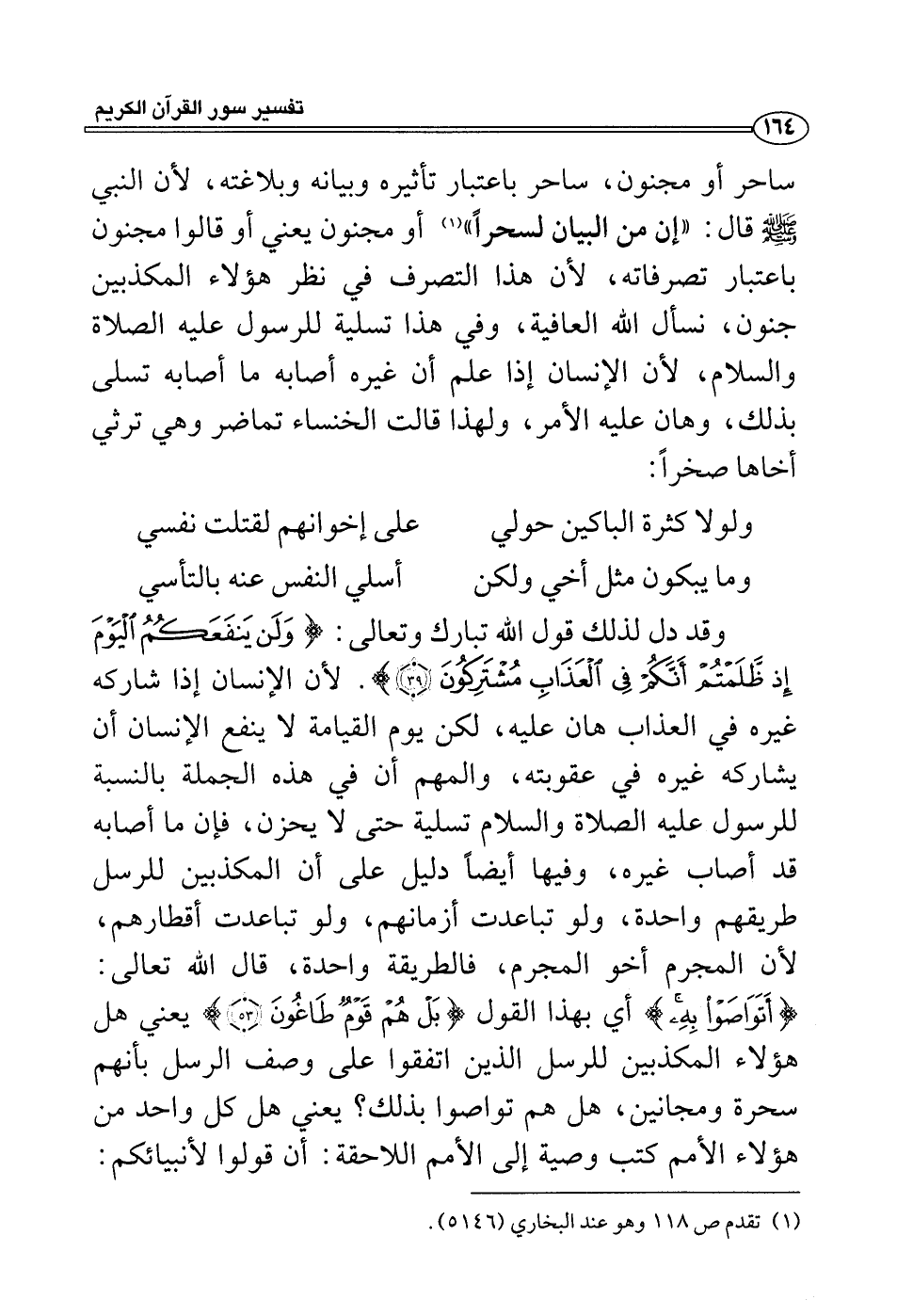 وقد دل لذلك قول الله تبارك وتعالى: {ولن ينفعكم اليوم إذ ظلمتم أنكم في العذاب مشتركون} . لأن الإنسان إذا شاركه غيره في العذاب هان عليه، لكن يوم القيامة لا ينفع الإنسان أن يشاركه غيره في عقوبته، والمهم أن في هذه الجملة بالنسبة للرسول عليه الصلاة والسلام تسلية حتى لا يحزن، فإن ما أصابه قد أصاب غيره، وفيها أيضاً دليل على أن المكذبين للرسل طريقهم واحدة، ولو تباعدت أزمانهم، ولو تباعدت أقطارهم، لأن المجرم أخو المجرم، فالطريقة واحدة، قال الله تعالى: {أتواصوا به} أي بهذا القول {بل هم قوم طاغون} يعني هل هؤلاء المكذبين للرسل الذين اتفقوا على وصف الرسل بأنهم سحرة ومجانين، هل هم تواصوا بذلك؟ يعني هل كل واحد من هؤلاء الأمم كتب وصية إلى الأمم اللاحقة: أن قولوا لأنبيائكم: