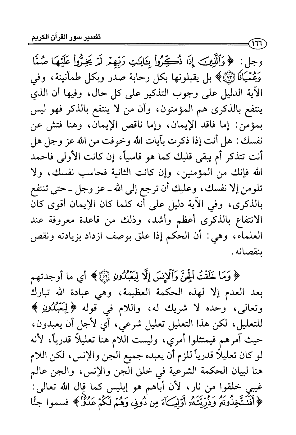وجل: {والذين إذا ذكروا بآيات ربهم لم يخروا عليها صماً وعمياناً} بل يقبلونها بكل رحابة صدر وبكل طمأنينة، وفي الآية الدليل على وجوب التذكير على كل حال، وفيها أن الذي ينتفع بالذكرى هم المؤمنون، وأن من لا ينتفع بالذكر فهو ليس بمؤمن: إما فاقد الإيمان، وإما ناقص الإيمان، وهنا فتش عن نفسك: هل أنت إذا ذكرت بآيات الله وخوفت من الله عز وجل هل أنت تتذكر أم يبقى قلبك كما هو قاسياً، إن كانت الأولى فاحمد الله فإنك من المؤمنين، وإن كانت الثانية فحاسب نفسك، ولا تلومن إلا نفسك، وعليك أن ترجع إلى الله - عز وجل - حتى تنتفع بالذكرى، وفي الآية دليل على أنه كلما كان الإيمان أقوى كان الانتفاع بالذكرى أعظم وأشد، وذلك من قاعدة معروفة عند العلماء، وهي: أن الحكم إذا علق بوصف ازداد بزيادته ونقص بنقصانه.