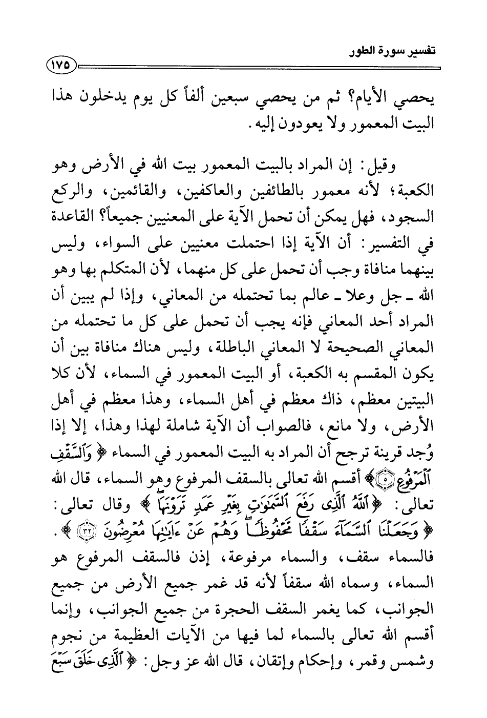 وقيل: إن المراد بالبيت المعمور بيت الله في الأرض وهو الكعبة؛ لأنه معمور بالطائفين والعاكفين، والقائمين، والركع السجود، فهل يمكن أن تحمل الآية على المعنيين جميعاً؟ القاعدة في التفسير: أن الآية إذا احتملت معنيين على السواء، وليس بينهما منافاة وجب أن تحمل على كل منهما، لأن المتكلم بها وهو الله - جل وعلا - عالم بما تحتمله من المعاني، وإذا لم يبين أن المراد أحد المعاني فإنه يجب أن تحمل على كل ما تحتمله من المعاني الصحيحة لا المعاني الباطلة، وليس هناك منافاة بين أن يكون المقسم به الكعبة، أو البيت المعمور في السماء، لأن كلا البيتين معظم، ذاك معظم في أهل السماء، وهذا معظم في أهل الأرض، ولا مانع، فالصواب أن الآية شاملة لهذا وهذا، إلا إذا وُجد قرينة ترجح أن المراد به البيت المعمور في السماء {والسقف المرفوع} أقسم الله تعالى بالسقف المرفوع وهو السماء، قال الله تعالى: {الله الذي رفع السماوات بغير عمد ترونها} وقال تعالى: {وجعلنا السماء سقفاً محفوظاً وهم عن ءاياتها معرضون} . فالسماء سقف، والسماء مرفوعة، إذن فالسقف المرفوع هو السماء، وسماه الله سقفاً لأنه قد غمر جميع الأرض من جميع الجوانب، كما يغمر السقف الحجرة من جميع الجوانب، وإنما أقسم الله تعالى بالسماء لما فيها من الآيات العظيمة من نجوم وشمس وقمر، وإحكام وإتقان، قال الله عز وجل: {الذي خلق سبع