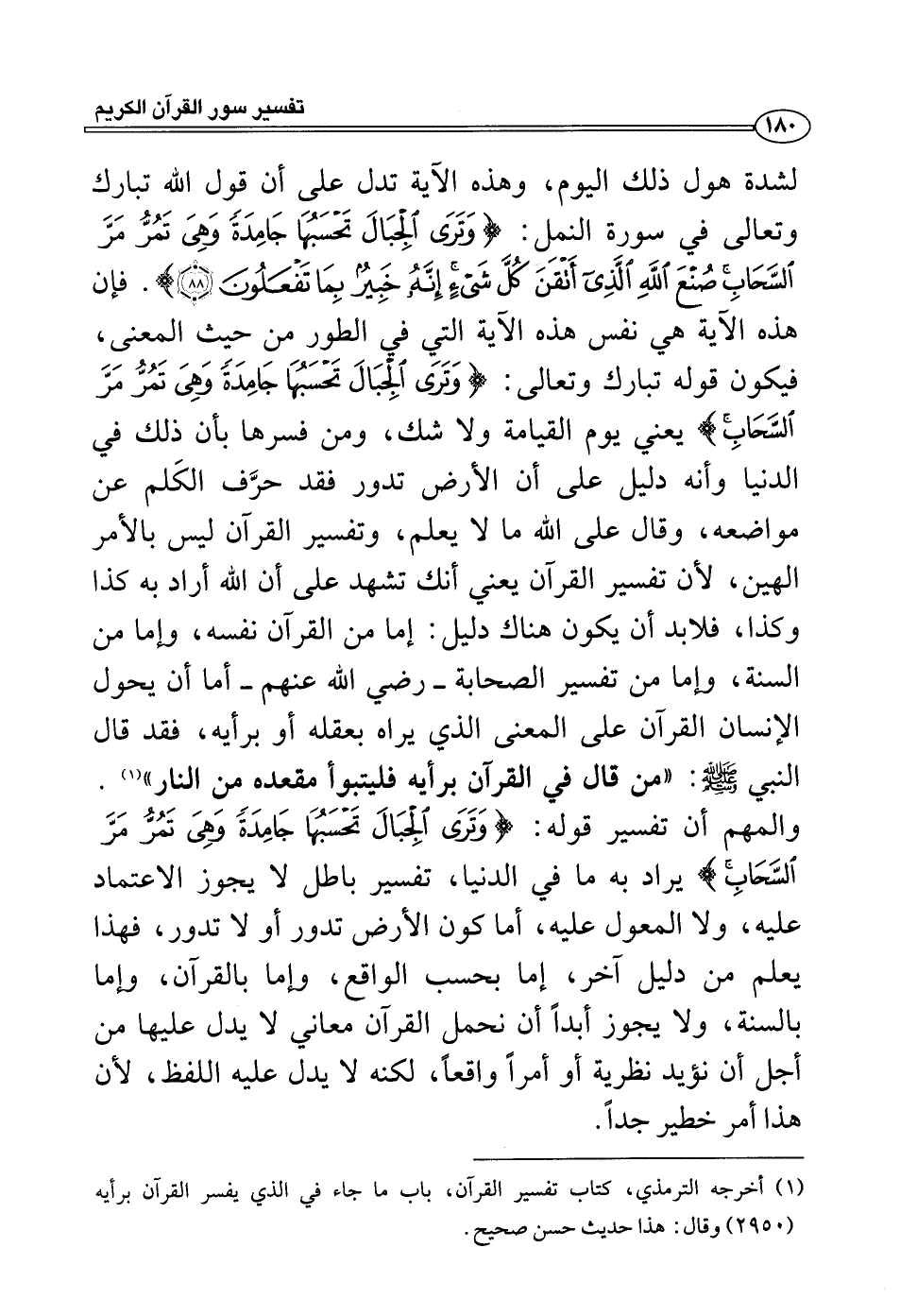 فإن هذه الآية هي نفس هذه الآية التي في الطور من حيث المعنى، فيكون قوله تبارك وتعالى: {وترى الجبال تحسبها جامدةً وهي تمر مر السحاب} يعني يوم القيامة ولا شك، ومن فسرها بأن ذلك في الدنيا وأنه دليل على أن الأرض تدور فقد حرَّف الكَلم عن مواضعه، وقال على الله ما لا يعلم، وتفسير القرآن ليس بالأمر الهين، لأن تفسير القرآن يعني أنك تشهد على أن الله أراد به كذا وكذا، فلابد أن يكون هناك دليل: إما من القرآن نفسه، وإما من السنة، وإما من تفسير الصحابة - رضي الله عنهم - أما أن يحول الإنسان القرآن على المعنى الذي يراه بعقله أو برأيه، فقد قال النبي صلى الله عليه وسلم: «من قال في القرآن برأيه فليتبوأ مقعده من النار» (¬1) . والمهم أن تفسير قوله: {وترى الجبال تحسبها جامدةً وهي تمر مر السحاب} يراد به ما في الدنيا، تفسير باطل لا يجوز الاعتماد عليه، ولا المعول عليه، أما كون الأرض تدور أو لا تدور، فهذا يعلم من دليل آخر، إما بحسب الواقع، وإما بالقرآن، وإما بالسنة، ولا يجوز أبداً أن نحمل القرآن معاني لا يدل عليها من أجل أن نؤيد نظرية أو أمراً واقعاً، لكنه لا يدل عليه اللفظ، لأن هذا أمر خطير جداً.