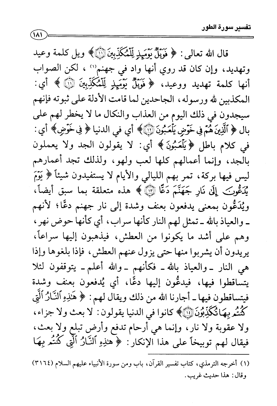 قال الله تعالى: {فويل يومئذ للمكذبين} ويل كلمة وعيد وتهديد، وإن كان قد روي أنها واد في جهنم (¬1) ، لكن الصواب أنها كلمة تهديد ووعيد، {فويل يومئذ للمكذبين} أي: المكذبين لله ورسوله، الجاحدين لما قامت الأدلة على ثبوته فإنهم سيجدون في ذلك اليوم من العذاب والنكال ما لا يخطر لهم على بال {الذين هم في خوض يلعبون} أي في الدنيا {في خوض} أي: في كلام باطل {يلعبون} أي: لا يقولون الجد ولا يعملون بالجد، وإنما أعمالهم كلها لعب ولهو، ولذلك تجد أعمارهم ليس فيها بركة، تمر بهم الليالي والأيام لا يستفيدون شيئاً {يوم يدعون إلى نار جهنم دعا} هذه متعلقة بما سبق أيضاً، ويُدَعُّون بمعنى يدفعون بعنف وشدة إلى نار جهنم دعًّا؛ لأنهم - والعياذ بالله - تمثل لهم النار كأنها سراب، أي كأنها حوض نهر، وهم على أشد ما يكونوا من العطش، فيذهبون إليها سراعاً، يريدون أن يشربوا منها حتى يزول عنهم العطش، فإذا بلغوها وإذا هي النار - والعياذ بالله - فكأنهم - والله أعلم - يتوقفون لئلا يتساقطوا فيها، فيدعُّون إليها دعًّا، أي يُدفعون بعنف وشدة فيتساقطون فيها - أجارنا الله من ذلك ويقال لهم: {هذه النار التى كنتم بها تكذبون} كانوا في الدنيا يقولون: لا بعث ولا جزاء، ولا عقوبة ولا نار، وإنما هي أرحام تدفع وأرض تبلع ولا بعث، فيقال لهم توبيخاً على هذا الإنكار: {هذه النار التى كنتم بها