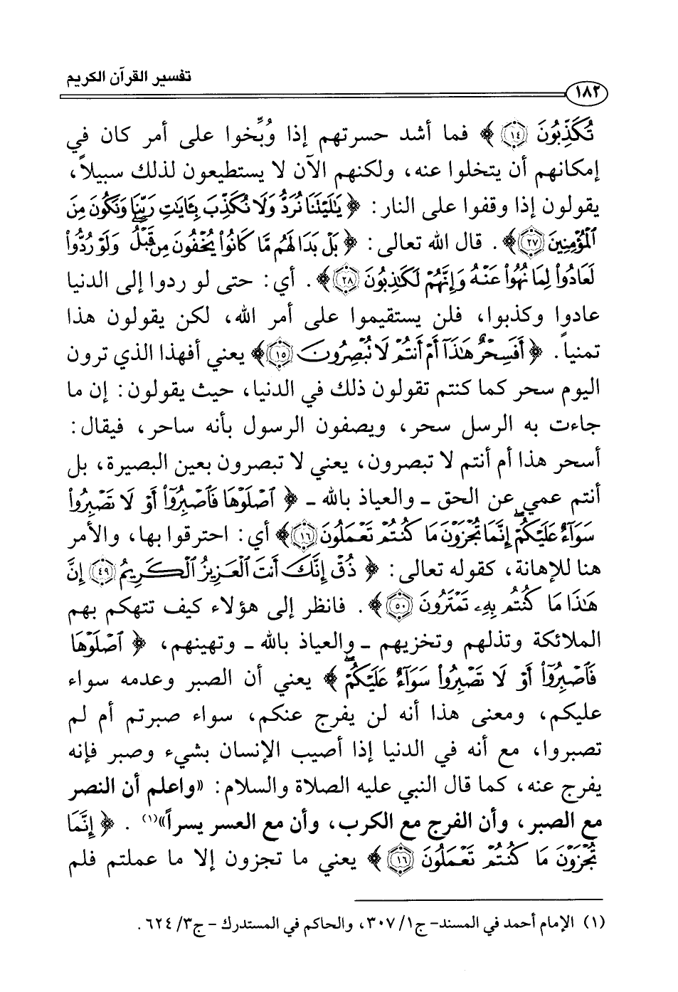 قال الله تعالى: {بل بدالهم ما كانوا يخفون من قبل ولو ردوا لعادوا لما نهوا عنه وإنهم لكاذبون} . أي: حتى لو ردوا إلى الدنيا عادوا وكذبوا، فلن يستقيموا على أمر الله، لكن يقولون هذا تمنياً. {أفسحر هذا أم أنتم لا تبصرون} يعني أفهذا الذي ترون اليوم سحر كما كنتم تقولون ذلك في الدنيا، حيث يقولون: إن ما جاءت به الرسل سحر، ويصفون الرسول بأنه ساحر، فيقال: أسحر هذا أم أنتم لا تبصرون، يعني لا تبصرون بعين البصيرة، بل أنتم عمي عن الحق - والعياذ بالله - {اصلوها فاصبروا أو لا تصبروا سواء عليكم إنما تجزون ما كنتم تعملون} أي: احترقوا بها، والأمر هنا للإهانة، كقوله تعالى: {ذق إنك أنت العزيز الكريم إن هذا ما كنتم به تمترون} . فانظر إلى هؤلاء كيف تتهكم بهم الملائكة وتذلهم وتخزيهم - والعياذ بالله - وتهينهم، {اصلوها فاصبروا أو لا تصبروا سواء عليكم} يعني أن الصبر وعدمه سواء عليكم، ومعنى هذا أنه لن يفرج عنكم، سواء صبرتم أم لم تصبروا، مع أنه في الدنيا إذا أصيب الإنسان بشيء وصبر فإنه يفرج عنه، كما قال النبي عليه الصلاة والسلام: «واعلم أن النصر مع الصبر، وأن الفرج مع الكرب، وأن مع العسر يسراً» (¬1) .