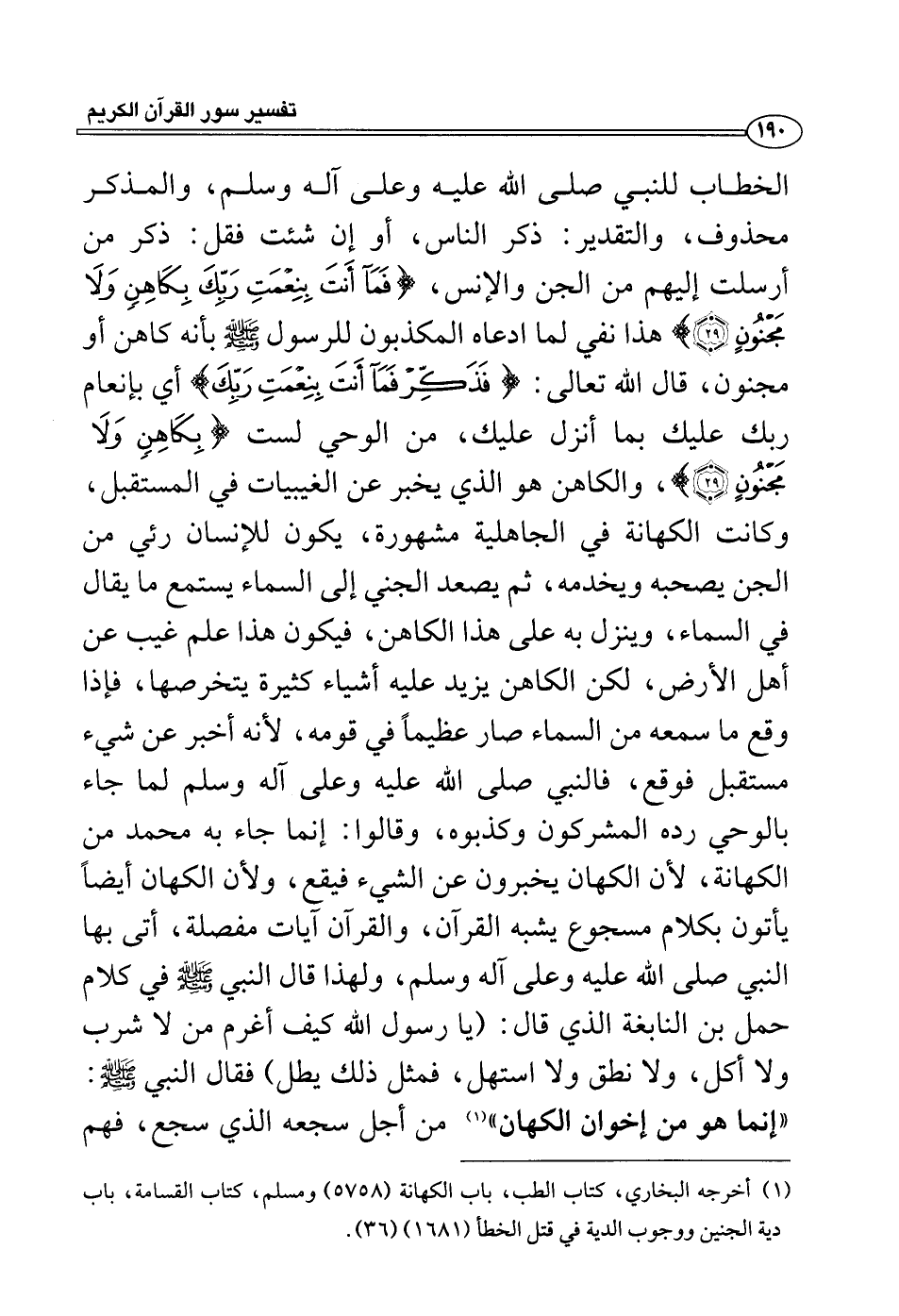 الخطاب للنبي صلى الله عليه وعلى آله وسلم، والمذكر محذوف، والتقدير: ذكر الناس، أو إن شئت فقل: ذكر من أرسلت إليهم من الجن والإنس، {فمآ أنت بنعمة ربك بكاهن ولا مجنون} هذا نفي لما ادعاه المكذبون للرسول صلى الله عليه وسلم بأنه كاهن أو مجنون، قال الله تعالى: {فذكر فمآ أنت بنعمة ربك} أي بإنعام ربك عليك بما أنزل عليك، من الوحي لست {بكاهن ولا مجنون} ، والكاهن هو الذي يخبر عن الغيبيات في المستقبل، وكانت الكهانة في الجاهلية مشهورة، يكون للإنسان رئي من الجن يصحبه ويخدمه، ثم يصعد الجني إلى السماء يستمع ما يقال في السماء، وينزل به على هذا الكاهن، فيكون هذا علم غيب عن أهل الأرض، لكن الكاهن يزيد عليه أشياء كثيرة يتخرصها، فإذا وقع ما سمعه من السماء صار عظيماً في قومه، لأنه أخبر عن شيء مستقبل فوقع، فالنبي صلى الله عليه وعلى آله وسلم لما جاء بالوحي رده المشركون وكذبوه، وقالوا: إنما جاء به محمد من الكهانة، لأن الكهان يخبرون عن الشيء فيقع، ولأن الكهان أيضاً يأتون بكلام مسجوع يشبه القرآن، والقرآن آيات مفصلة، أتى بها النبي صلى الله عليه وعلى آله وسلم، ولهذا قال النبي صلى الله عليه وسلم في كلام حمل بن النابغة الذي قال: (يا رسول الله كيف أغرم من لا شرب ولا أكل، ولا نطق ولا استهل، فمثل ذلك يطل) فقال النبي صلى الله عليه وسلم: «إنما هو من إخوان الكهان» (¬1)