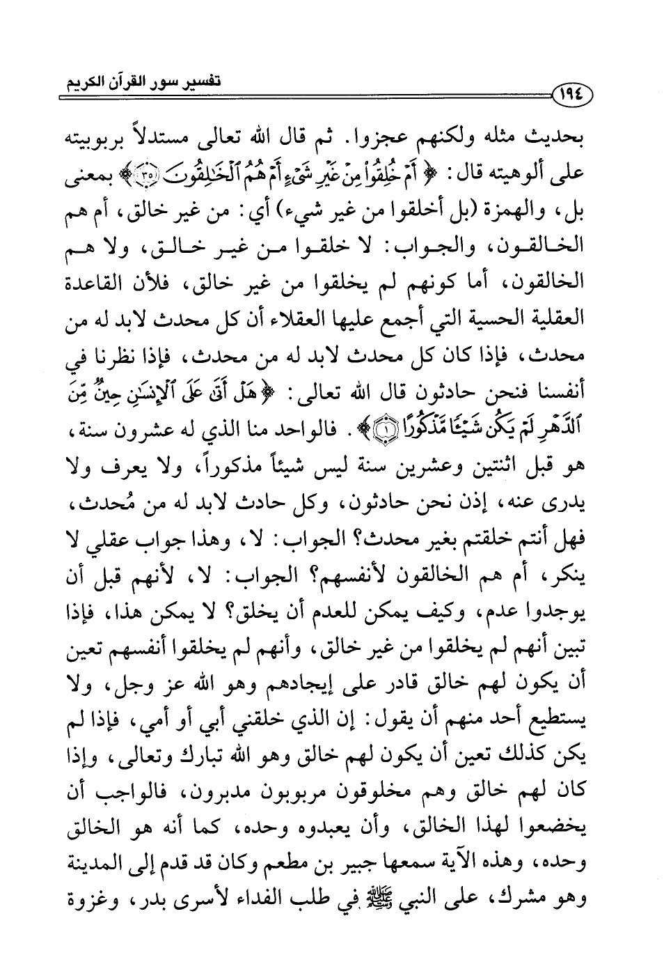 فالواحد منا الذي له عشرون سنة، هو قبل اثنتين وعشرين سنة ليس شيئاً مذكوراً، ولا يعرف ولا يدرى عنه، إذن نحن حادثون، وكل حادث لابد له من مُحدث، فهل أنتم خلقتم بغير محدث؟ الجواب: لا، وهذا جواب عقلي لا ينكر، أم هم الخالقون لأنفسهم؟ الجواب: لا، لأنهم قبل أن يوجدوا عدم، وكيف يمكن للعدم أن يخلق؟ لا يمكن هذا، فإذا تبين أنهم لم يخلقوا من غير خالق، وأنهم لم يخلقوا أنفسهم تعين أن يكون لهم خالق قادر على إيجادهم وهو الله عز وجل، ولا يستطيع أحد منهم أن يقول: إن الذي خلقني أبي أو أمي، فإذا لم يكن كذلك تعين أن يكون لهم خالق وهو الله تبارك وتعالى، وإذا كان لهم خالق وهم مخلوقون مربوبون مدبرون، فالواجب أن يخضعوا لهذا الخالق، وأن يعبدوه وحده، كما أنه هو الخالق وحده، وهذه الآية سمعها جبير بن مطعم وكان قد قدم إلى المدينة وهو مشرك، على النبي صلى الله عليه وسلم في طلب الفداء لأسرى بدر، وغزوة