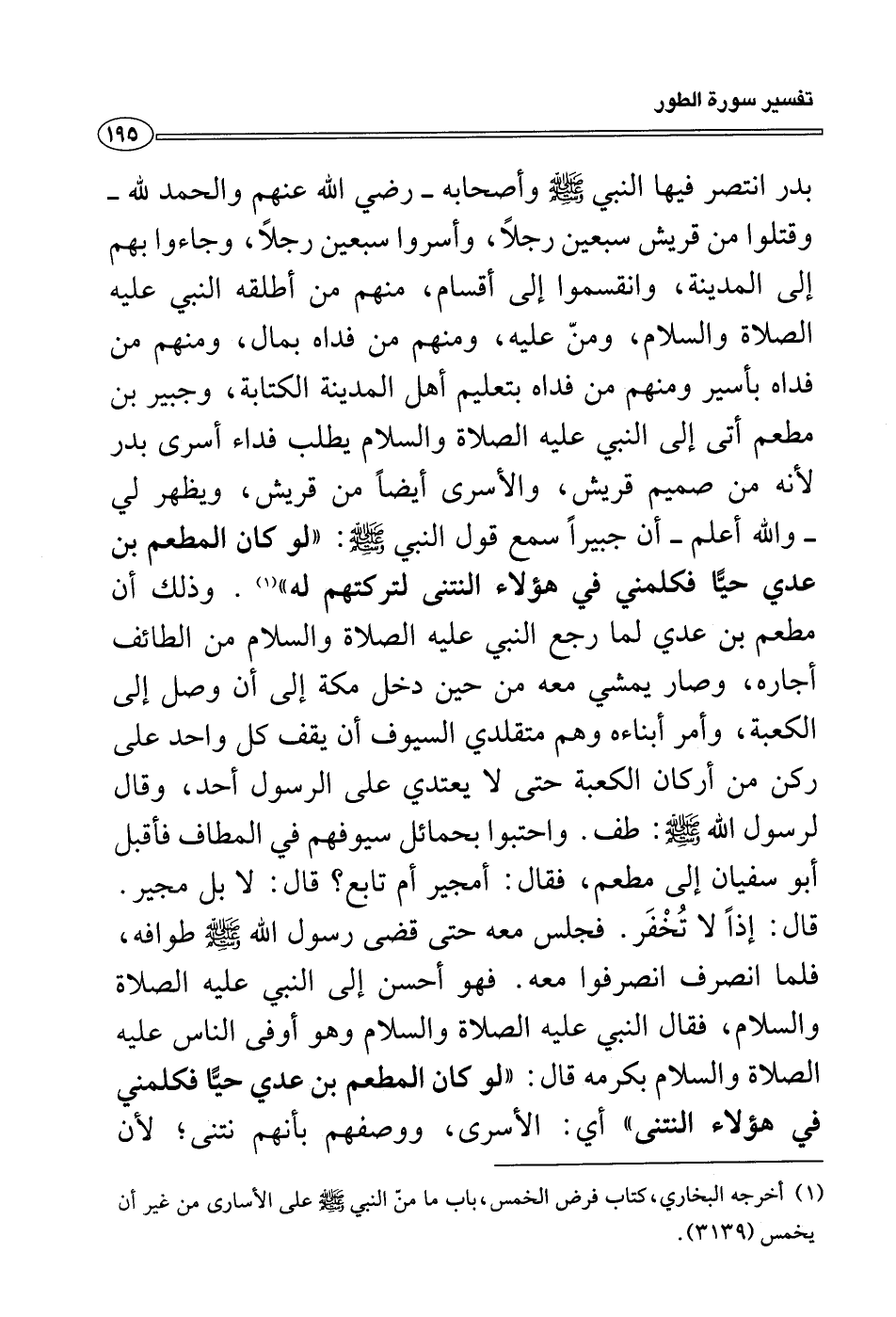 بدر انتصر فيها النبي صلى الله عليه وسلم وأصحابه - رضي الله عنهم والحمد لله - وقتلوا من قريش سبعين رجلاً، وأسروا سبعين رجلاً، وجاءوا بهم إلى المدينة، وانقسموا إلى أقسام، منهم من أطلقه النبي عليه الصلاة والسلام، ومنّ عليه، ومنهم من فداه بمال، ومنهم من فداه بأسير ومنهم من فداه بتعليم أهل المدينة الكتابة، وجبير بن مطعم أتى إلى النبي عليه الصلاة والسلام يطلب فداء أسرى بدر لأنه من صميم قريش، والأسرى أيضاً من قريش، ويظهر لي - والله أعلم - أن جبيراً سمع قول النبي صلى الله عليه وسلم: «لو كان المطعم بن عدي حيًّا فكلمني في هؤلاء النتنى لتركتهم له» (¬1) .
