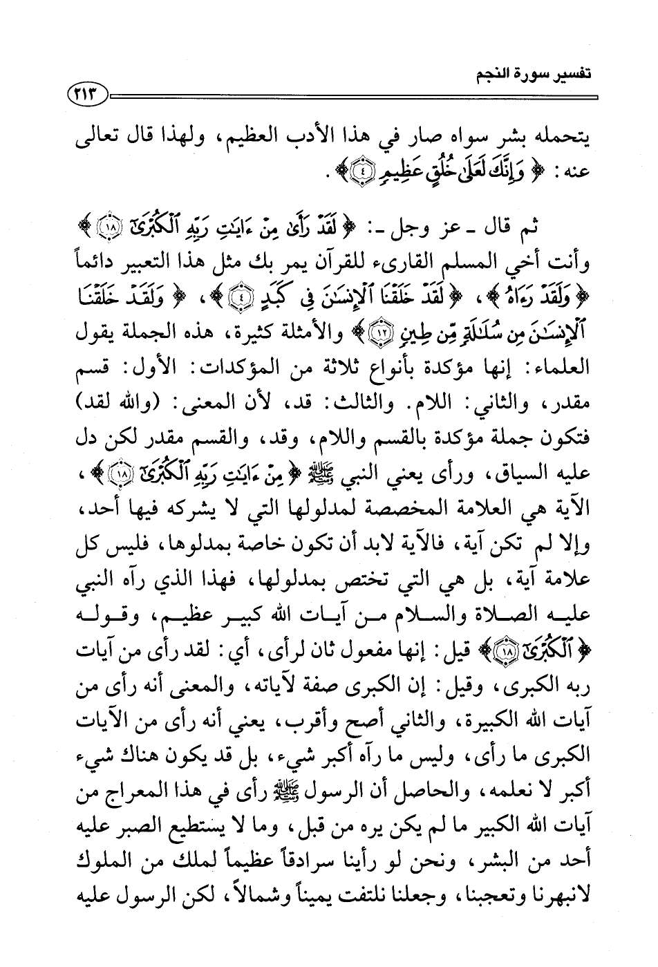 والثالث: قد، لأن المعنى: (والله لقد) فتكون جملة مؤكدة بالقسم واللام، وقد، والقسم مقدر لكن دل عليه السياق، ورأى يعني النبي صلى الله عليه وسلم {من آيات ربه الكبرى} ، الآية هي العلامة المخصصة لمدلولها التي لا يشركه فيها أحد، وإلا لم تكن آية، فالآية لابد أن تكون خاصة بمدلوها، فليس كل علامة آية، بل هي التي تختص بمدلولها، فهذا الذي رآه النبي عليه الصلاة والسلام من آيات الله كبير عظيم، وقوله {الكبرى} قيل: إنها مفعول ثان لرأى، أي: لقد رأى من آيات ربه الكبرى، وقيل: إن الكبرى صفة لآياته، والمعنى أنه رأى من آيات الله الكبيرة، والثاني أصح وأقرب، يعني أنه رأى من الآيات الكبرى ما رأى، وليس ما رآه أكبر شيء، بل قد يكون هناك شيء أكبر لا نعلمه، والحاصل أن الرسول صلى الله عليه وسلم رأى في هذا المعراج من آيات الله الكبير ما لم يكن يره من قبل، وما لا يستطيع الصبر عليه أحد من البشر، ونحن لو رأينا سرادقاً عظيماً لملك من الملوك لانبهرنا وتعجبنا، وجعلنا نلتفت يميناً وشمالاً، لكن الرسول عليه