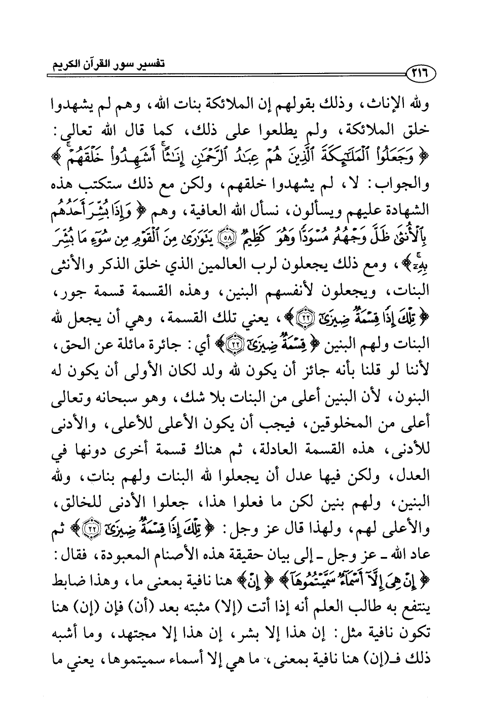 لأنفسهم البنين، وهذه القسمة قسمة جور، {تلك إذاً قسمة ضيزى} ، يعني تلك القسمة، وهي أن يجعل لله البنات ولهم البنين {قسمة ضيزى} أي: جائرة مائلة عن الحق، لأننا لو قلنا بأنه جائز أن يكون لله ولد لكان الأولى أن يكون له البنون، لأن البنين أعلى من البنات بلا شك، وهو سبحانه وتعالى أعلى من المخلوقين، فيجب أن يكون الأعلى للأعلى، والأدنى للأدنى، هذه القسمة العادلة، ثم هناك قسمة أخرى دونها في العدل، ولكن فيها عدل أن يجعلوا لله البنات ولهم بنات، ولله البنين، ولهم بنين لكن ما فعلوا هذا، جعلوا الأدنى للخالق، والأعلى لهم، ولهذا قال عز وجل: {تلك إذاً قسمة ضيزى} ثم عاد الله - عز وجل - إلى بيان حقيقة هذه الأصنام المعبودة، فقال: {إن هي إلا أسماء سميتموهآ} {إن} هنا نافية بمعنى ما، وهذا ضابط ينتفع به طالب العلم أنه إذا أتت (إلا) مثبتة بعد (أن) فإن (إن) هنا تكون نافية مثل: إن هذا إلا بشر، إن هذا إلا مجتهد، وما أشبه ذلك فـ (إن) هنا نافية بمعنى، ما هي إلا أسماء سميتموها، يعني ما
