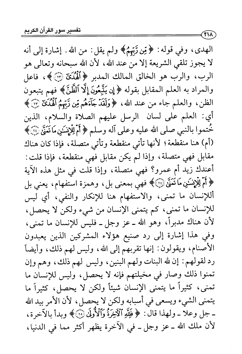 إشارة إلى أنه لا يجوز تلقي الشريعة إلا من عند الله، لأن الله سبحانه وتعالى هو الرب، والرب هو الخالق المالك المدبر {الهدى} ، فاعل والمراد به العلم المقابل بقوله {إن يتبعون إلا الظن} فهم يتبعون الظن، والعلم جاء من عند الله، {ولقد جاءهم من ربهم الهدى} أي: العلم على لسان الرسل عليهم الصلاة والسلام، الذين خُتموا بالنبي صلى الله عليه وعلى آله وسلم {أم للإنسان ما تمنى} (أم) هنا منقطعة؛ لأنها تأتي منقطعة وتأتي متصلة، فإذا كان هناك مقابل فهي متصلة، وإذا لم يكن مقابل فهي منقطعة، فإذا قلت: أعندك زيد أم عمرو؟ فهي متصلة، وإذا قلت في مثل هذه الآية {أم للإنسان ما تمنى} فهي بمعنى بل، وهمزة استفهام، يعني بل أللإنسان ما تمنى، والاستفهام هنا للإنكار والنفي، أي ليس للإنسان ما تمنى، كم يتمنى الإنسان من شيء ولكن لا يحصل، لأن هناك مدبراً، وهو الله - عز وجل - فليس للإنسان ما تمنى، وفي هذا إشارة إلى رد صنيع هؤلاء المشركين الذين يعبدون الأصنام، ويقولون: إنها تقربهم إلى الله، وليس لهم ذلك، وأيضاً رد لقولهم: إن لله البنات ولهم البنين، وليس لهم ذلك، وهم وإن تمنوا ذلك وصار في مخيلتهم فإنه لا يحصل، وليس للإنسان ما تمنى، كثيراً ما يتمنى الإنسان شيئاً ولكن لا يحصل، كثيراً ما يتمنى الشيء ويسعى في أسبابه ولكن لا يحصل، لأن الأمر بيد الله - جل وعلا - ولهذا قال: {فلله الآخرة والأُولى} وبدأ بالآخرة، لأن ملك الله - عز وجل - في الآخرة يظهر أكثر مما في الدنيا،