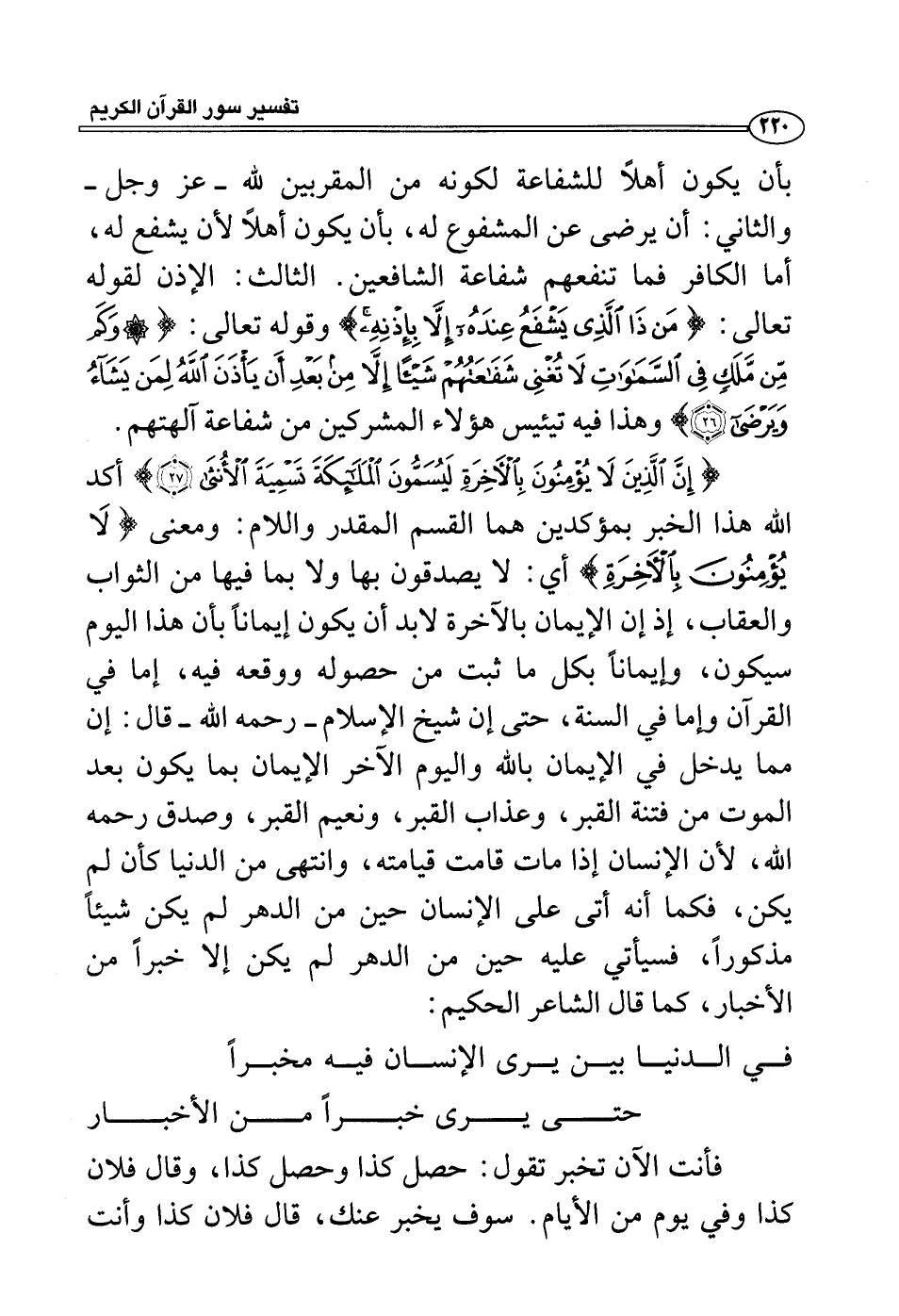 {إن الذين لا يؤمنون بالآخرة ليسمون الملائكة تسمية الأُنثى} أكد الله هذا الخبر بمؤكدين هما القسم المقدر واللام: ومعنى {لا يؤمنون بالآخرة} أي: لا يصدقون بها ولا بما فيها من الثواب والعقاب، إذ إن الإيمان بالآخرة لابد أن يكون إيماناً بأن هذا اليوم سيكون، وإيماناً بكل ما ثبت من حصوله ووقعه فيه، إما في القرآن وإما في السنة، حتى إن شيخ الإسلام - رحمه الله - قال: إن مما يدخل في الإيمان بالله واليوم الآخر الإيمان بما يكون بعد الموت من فتنة القبر، وعذاب القبر، ونعيم القبر، وصدق رحمه الله، لأن الإنسان إذا مات قامت قيامته، وانتهى من الدنيا كأن لم يكن، فكما أنه أتى على الإنسان حين من الدهر لم يكن شيئاً مذكوراً، فسيأتي عليه حين من الدهر لم يكن إلا خبراً من الأخبار، كما قال الشاعر الحكيم: