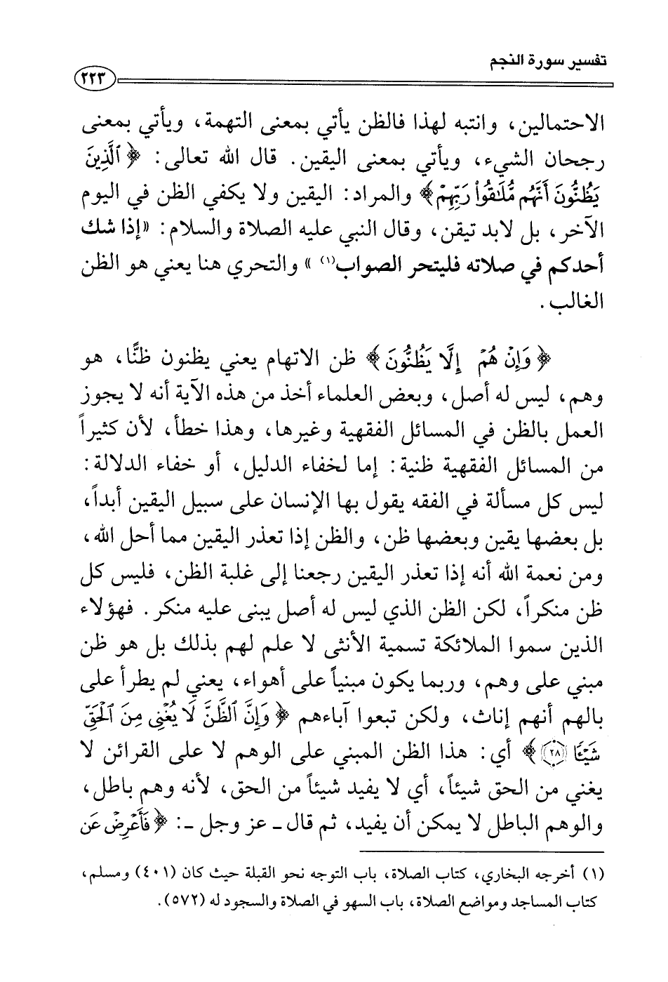 {وإن هم إلا يظنون} ظن الاتهام يعني يظنون ظنًّا، هو وهم، ليس له أصل، وبعض العلماء أخذ من هذه الآية أنه لا يجوز العمل بالظن في المسائل الفقهية وغيرها، وهذا خطأ، لأن كثيراً من المسائل الفقهية ظنية: إما لخفاء الدليل، أو خفاء الدلالة: ليس كل مسألة في الفقه يقول بها الإنسان على سبيل اليقين أبداً، بل بعضها يقين وبعضها ظن، والظن إذا تعذر اليقين مما أحل الله، ومن نعمة الله أنه إذا تعذر اليقين رجعنا إلى غلبة الظن، فليس كل ظن منكراً، لكن الظن الذي ليس له أصل يبنى عليه منكر. فهؤلاء الذين سموا الملائكة تسمية الأنثى لا علم لهم بذلك بل هو ظن مبني على وهم، وربما يكون مبنياً على أهواء، يعني لم يطرأ على بالهم أنهم إناث، ولكن تبعوا آباءهم {وإن الظن لا يغني من الحق شيئاً} أي: هذا الظن المبني على الوهم لا على القرائن لا يغني من الحق شيئاً، أي لا يفيد شيئاً من الحق، لأنه وهم باطل، والوهم الباطل لا يمكن أن يفيد، ثم قال - عز وجل -: {فأعرض عن