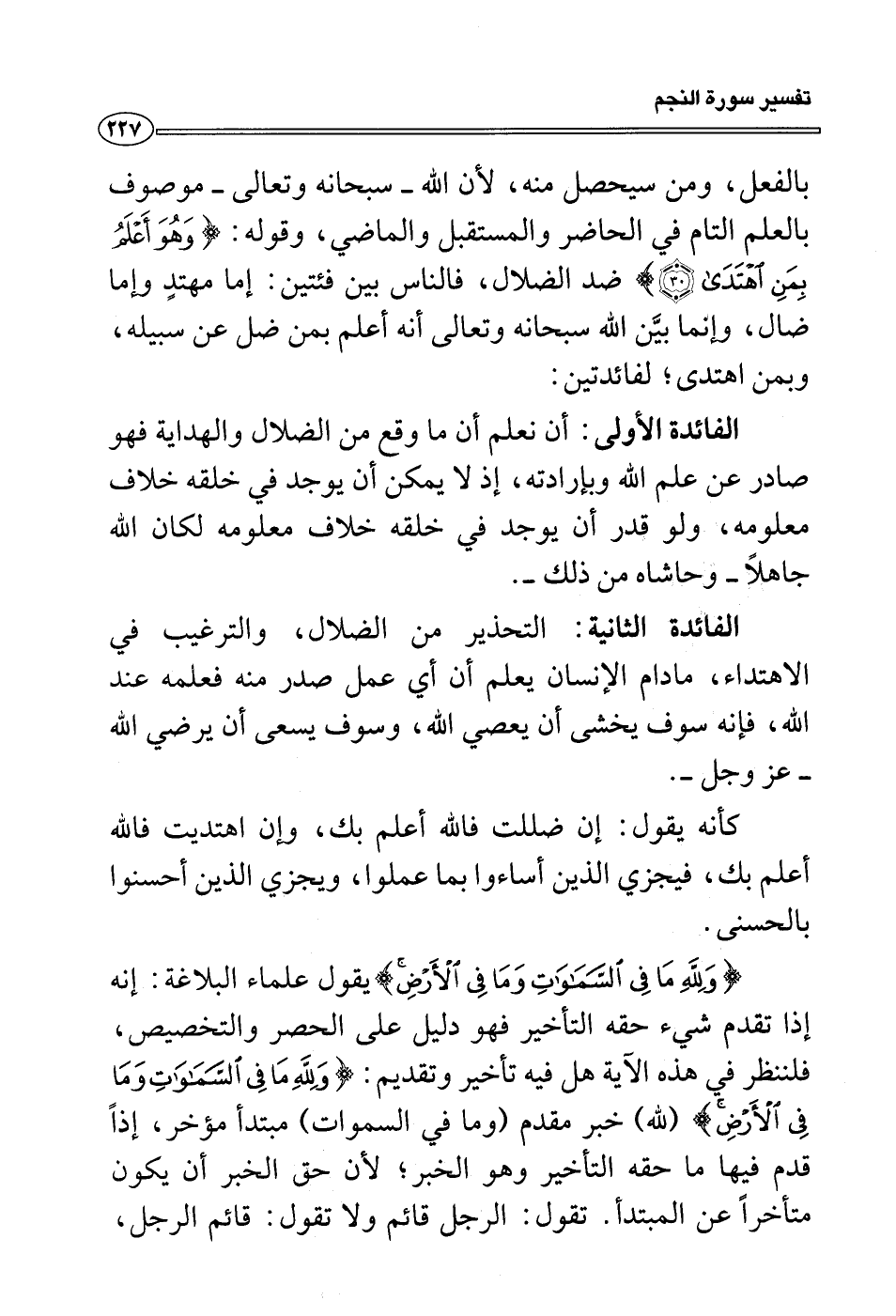 الفائدة الأولى: أن نعلم أن ما وقع من الضلال والهداية فهو صادر عن علم الله وبإرادته، إذ لا يمكن أن يوجد في خلقه خلاف معلومه، ولو قدر أن يوجد في خلقه خلاف معلومه لكان الله جاهلاً - وحاشاه من ذلك -.