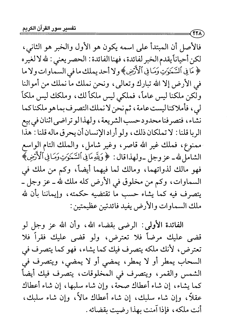 الفائدة الأولى: الرضى بقضاء الله، وأن الله عز وجل لو قضى عليك مرضاً فلا تعترض، ولو قضى عليك فقراً فلا تعترض، لأنك ملكه يتصرف فيك كما يشاء، فهو كما يتصرف في السحاب يمطر أو لا يمطر، يمضي أو لا يمضي، ويتصرف في الشمس والقمر، ويتصرف في المخلوقات، يتصرف فيك أيضاً كما يشاء، إن شاء أعطاك صحة، وإن شاء سلبها، إن شاء أعطاك عقلاً، وإن شاء سلبك، إن شاء أعطاك مالاً، وإن شاء سلبك، أنت ملكه، فإذا آمنت بهذا رضيت بقضائه.