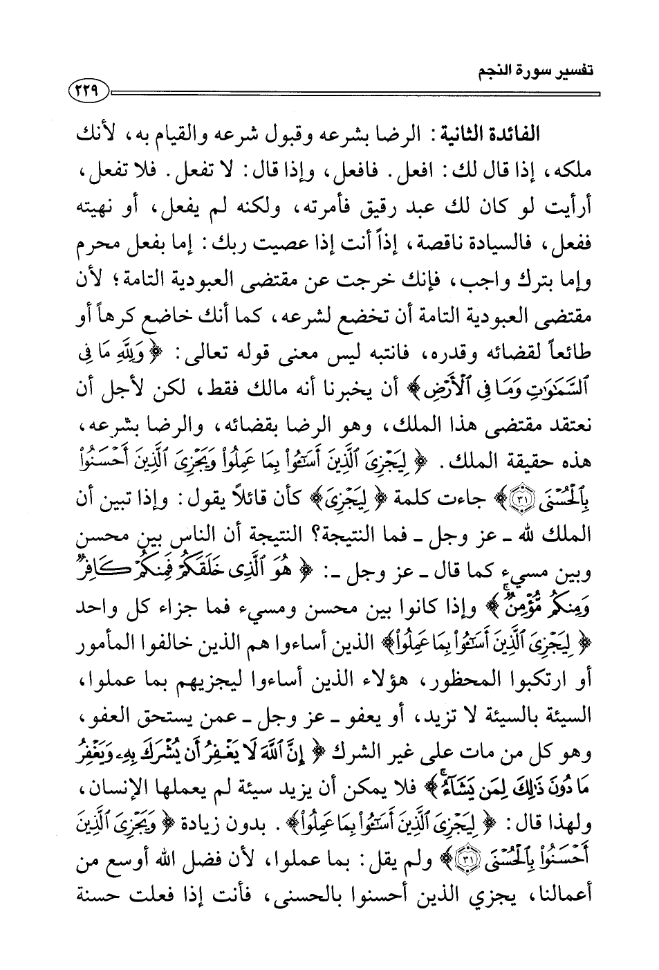 الفائدة الثانية: الرضا بشرعه وقبول شرعه والقيام به، لأنك ملكه، إذا قال لك: افعل. فافعل، وإذا قال: لا تفعل. فلا تفعل، أرأيت لو كان لك عبد رقيق فأمرته، ولكنه لم يفعل، أو نهيته ففعل، فالسيادة ناقصة، إذاً أنت إذا عصيت ربك: إما بفعل محرم وإما بترك واجب، فإنك خرجت عن مقتضى العبودية التامة؛ لأن مقتضى العبودية التامة أن تخضع لشرعه، كما أنك خاضع كرهاً أو طائعاً لقضائه وقدره، فانتبه ليس معنى قوله تعالى: {ولله ما في السماوات وما في الأَرض} أن يخبرنا أنه مالك فقط، لكن لأجل أن نعتقد مقتضى هذا الملك، وهو الرضا بقضائه، والرضا بشرعه، هذه حقيقة الملك. {ليجزى الذين أساءوا بما عملوا ويجزى الذين أحسنوا بالحسنى} جاءت كلمة {ليجزى} كأن قائلاً يقول: وإذا تبين أن الملك لله - عز وجل - فما النتيجة؟ النتيجة أن الناس بين محسن وبين مسيء كما قال - عز وجل -: {هو الذي خلقكم فمنكم كافر ومنكم مؤمن} وإذا كانوا بين محسن ومسيء فما جزاء كل واحد {ليجزى الذين أساءوا بما عملوا} الذين أساءوا هم الذين خالفوا المأمور أو ارتكبوا المحظور، هؤلاء الذين أساءوا ليجزيهم بما عملوا، السيئة بالسيئة لا تزيد، أو يعفو - عز وجل - عمن يستحق العفو، وهو كل من مات على غير الشرك {إن الله لا يغفر أن يشرك به ويغفر ما دون ذلك لمن يشاء} فلا يمكن أن يزيد سيئة لم يعملها الإنسان، ولهذا قال: {ليجزى الذين أساءوا بما عملوا} .