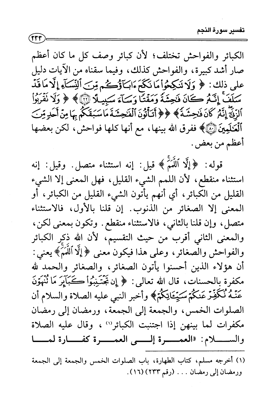 قوله: {إلا اللمم} قيل: إنه استثناء متصل. وقيل: إنه استثناء منقطع، لأن اللمم الشيء القليل، فهل المعنى إلا الشيء القليل من الكبائر، أي أنهم يأتون الشيء القليل من الكبائر، أو المعنى إلا الصغائر من الذنوب. إن قلنا بالأول، فالاستثناء متصل، وإن قلنا بالثاني، فالاستثناء منقطع. وتكون بمعنى لكن، والمعنى الثاني أقرب من حيث التقسيم، لأن الله ذكر الكبائر والفواحش والصغائر، وعلى هذا فيكون معنى {إلا اللمم} يعني: أن هؤلاء الذين أحسنوا يأتون الصغائر، والصغائر والحمد لله مكفرة بالحسنات، قال الله تعالى: {إن تجتنبوا كبآئر ما تنهون عنه نكفر عنكم سيئتكم} وأخبر النبي عليه الصلاة والسلام أن الصلوات الخمس، والجمعة إلى الجمعة، ورمضان إلى رمضان مكفرات لما بينهن إذا اجتنبت الكبائر (¬1) ، وقال عليه الصلاة والسلام: «العمرة إلى العمرة كفارة لما