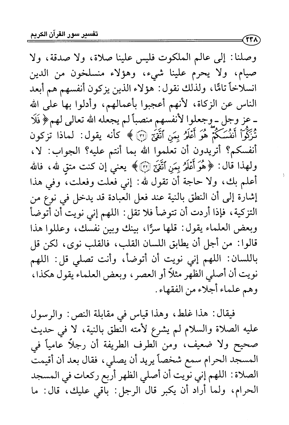 وصلنا: إلى عالم الملكوت فليس علينا صلاة، ولا صدقة، ولا صيام، ولا يحرم علينا شيء، وهؤلاء منسلخون من الدين انسلاخاً تامًّا، ولذلك نقول: هؤلاء الذين يزكون أنفسهم هم أبعد الناس عن الزكاة، لأنهم أعجبوا بأعمالهم، وأدلوا بها على الله - عز وجل - وجعلوا لأنفسهم منصباً لم يجعله الله تعالى لهم {فلا تزكوا أنفسكم هو أعلم بمن اتقى} كأنه يقول: لماذا تزكون أنفسكم؟ أتريدون أن تعلموا الله بما أنتم عليه؟ الجواب: لا، ولهذا قال: {هو أعلم بمن اتقى} يعني إن كنت متقٍ لله، فالله أعلم بك، ولا حاجة أن تقول لله: إني فعلت وفعلت، وفي هذا إشارة إلى أن النطق بالنية عند فعل العبادة قد يدخل في نوع من التزكية، فإذا أردت أن تتوضأ فلا تقل: اللهم إني نويت أن أتوضأ وبعض العلماء يقول: قلها سرًّا، بينك وبين نفسك، وعللوا هذا قالوا: من أجل أن يطابق اللسان القلب، فالقلب نوى، لكن قل باللسان: اللهم إني نويت أن أتوضأ، وأنت تصلي قل: اللهم نويت أن أصلي الظهر مثلاً أو العصر، وبعض