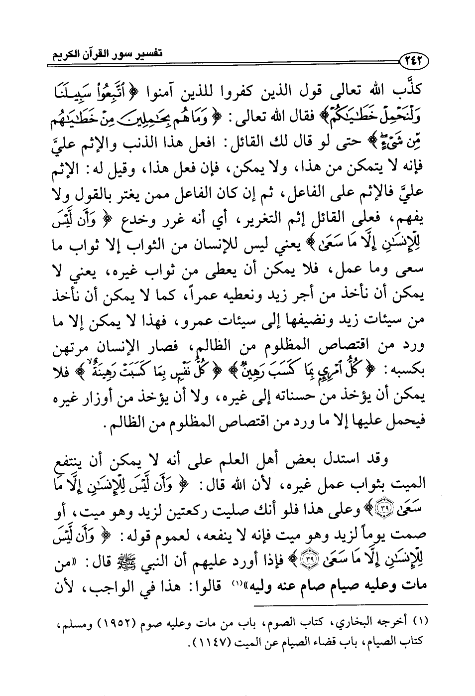كذَّب الله تعالى قول الذين كفروا للذين آمنوا {اتبعوا سبيلنا ولنحمل خطاياكم} فقال الله تعالى: {وما هم بحاملين من خطاياهم من شيء إنهم لكاذبون} حتى لو قال لك القائل: افعل هذا الذنب والإثم عليَّ فإنه لا يتمكن من هذا، ولا يمكن، فإن فعل هذا، وقيل له: الإثم عليَّ فالإثم على الفاعل، ثم إن كان الفاعل ممن يغتر بالقول ولا يفهم، فعلى القائل إثم التغرير، أي أنه غرر وخدع {وأن ليس للإنسان إلا ما سعى} يعني ليس للإنسان من الثواب إلا ثواب ما سعى وما عمل، فلا يمكن أن يعطى من ثواب غيره، يعني لا يمكن أن