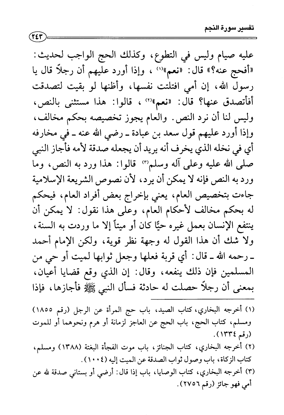 عليه صيام وليس في التطوع، وكذلك الحج الواجب لحديث: «أفحج عنه؟» قال: «نعم» (¬1) ، وإذا أورد عليهم أن رجلاً قال يا رسول الله، إن أمي افتلتت نفسها، وأظنها لو بقيت لتصدقت أفأتصدق عنها؟ قال: «نعم» (¬2) ، قالوا: هذا مستثنى بالنص، وليس لنا أن نرد النص. والعام يجوز تخصيصه بحكم مخالف، وإذا أورد عليهم قول سعد بن عبادة - رضي الله عنه - في مخارفه أي في نخله الذي يخرف أنه يريد أن يجعله صدقة لأمه فأجاز النبي صلى الله عليه وعلى آله وسلم (¬3)