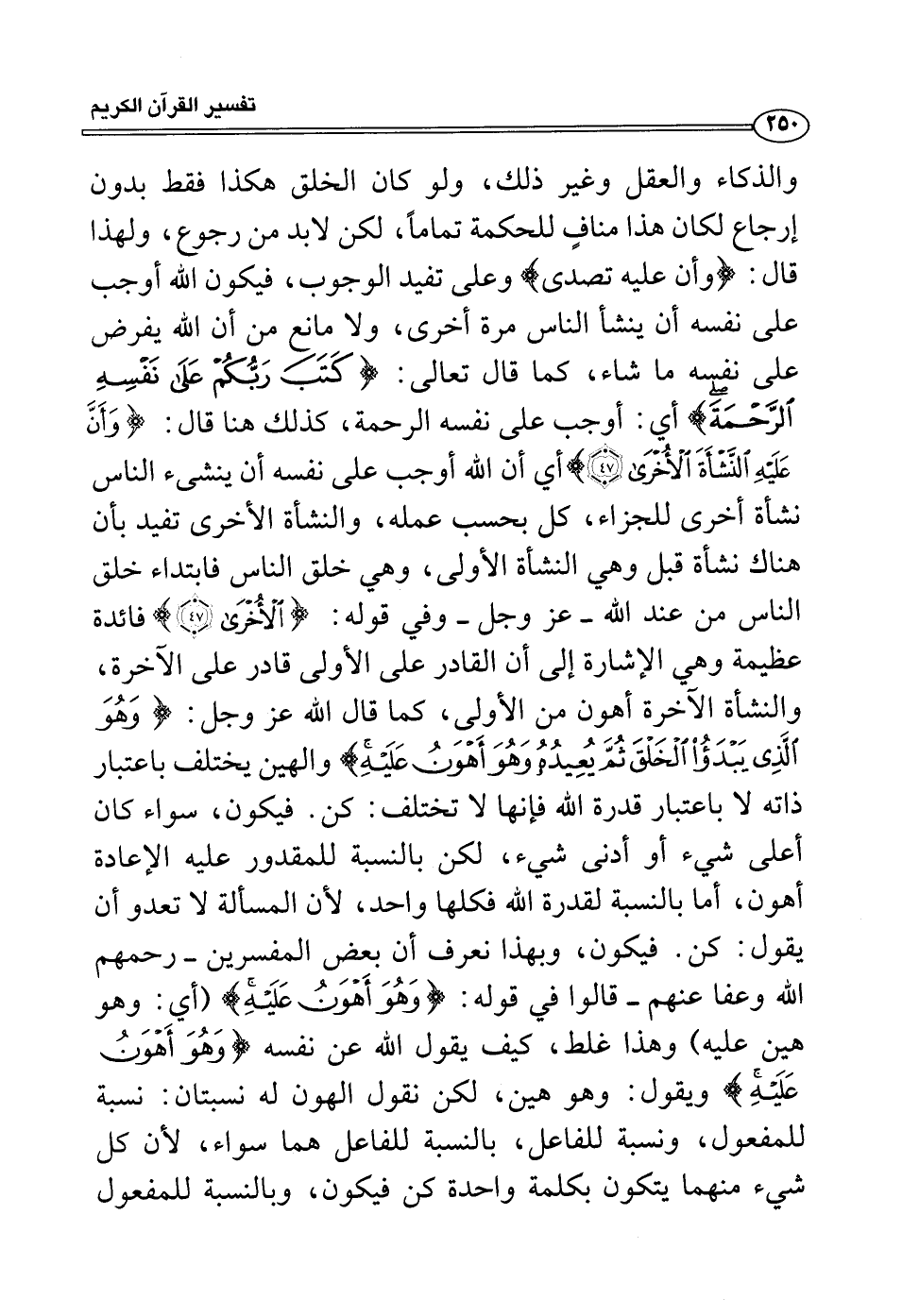 والذكاء والعقل وغير ذلك، ولو كان الخلق هكذا فقط بدون إرجاع لكان هذا منافٍ للحكمة تماماً، لكن لابد من رجوع، ولهذا قال: {وأن عليه تصدى} وعلى تفيد الوجوب، فيكون الله أوجب على نفسه أن ينشأ الناس مرة أخرى، ولا مانع من أن الله يفرض على نفسه ما شاء، كما قال تعالى: {كتب ربكم على نفسه الرحمة} أي: أوجب على نفسه الرحمة، كذلك هنا قال: {وأن عليه النشأة الأُخرى} أي أن الله أوجب على نفسه أن ينشىء الناس نشأة أخرى للجزاء، كل بحسب عمله، والنشأة الأخرى تفيد بأن هناك نشأة قبل وهي النشأة الأولى، وهي خلق الناس فابتداء خلق الناس من عند الله - عز وجل - وفي قوله: {الأُخرى} فائدة عظيمة وهي الإشارة إلى أن القادر على الأولى قادر على الآخرة، والنشأة الآخرة أهون من الأولى، كما قال الله عز وجل: {وهو الذي يبدأ الخلق ثم يعيده وهو أهون عليه} والهين يختلف باعتبار ذاته لا باعتبار قدرة الله فإنها لا تختلف: كن.