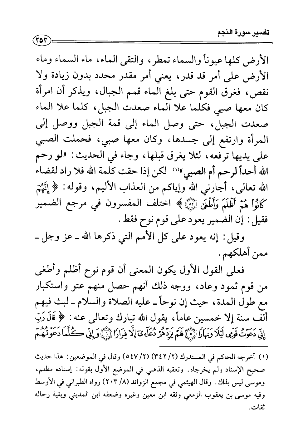 الأرض كلها عيوناً والسماء تمطر، والتقى الماء، ماء السماء وماء الأرض على أمر قد قدر، يعني أمر مقدر محدد بدون زيادة ولا نقص، فغرق القوم حتى بلغ الماء قمم الجبال، ويذكر أن امرأة كان معها صبي فكلما علا الماء صعدت الجبل، كلما علا الماء صعدت الجبل، حتى وصل الماء إلى قمة الجبل ووصل إلى المرأة وارتفع إلى جسدها، وكان معها صبي، فحملت الصبي على يديها ترفعه، لئلا يغرق قبلها، وجاء في الحديث: «لو رحم الله أحداً لرحم أم الصبي» (¬1) لكن إذا حقت كلمة الله فلا راد لقضاء الله تعالى، أجارني الله وإياكم من العذاب الأليم، وقوله: {إنهم كانوا هم أظلم وأطغى} اختلف المفسرون في مرجع الضمير فقيل: إن الضمير يعود على قوم نوح فقط.