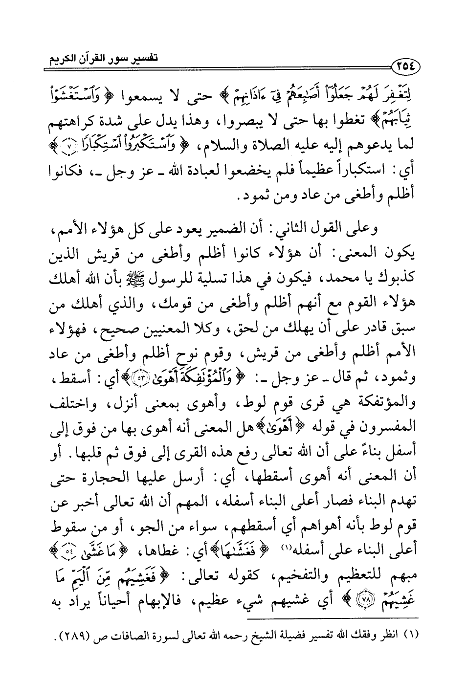 وعلى القول الثاني: إن الضمير يعود على كل هؤلاء الأمم، يكون المعنى: أن هؤلاء كانوا أظلم وأطغى من قريش الذين كذبوك يا محمد، فيكون في هذا تسلية للرسول صلى الله عليه وسلم بأن الله أهلك هؤلاء القوم مع أنهم أظلم وأطغى من قومك، والذي أهلك من سبق قادر على أن يهلك من لحق، وكلا المعنيين صحيح، فهؤلاء الأمم أظلم وأطغى من قريش، وقوم نوح أظلم وأطغى من عاد وثمود، ثم قال - عز وجل -: {والمؤتفكة أهوى} أي: أسقط، والمؤتفكة هي قرى قوم لوط، وأهوى بمعنى أنزل، واختلف المفسرون في قوله {أهوى} هل المعنى أنه أهوى بها من فوق إلى أسفل بناءً على أن الله تعالى رفع هذه القرى إلى فوق ثم قلبها. أو أن المعنى أنه أهوى أسقطها، أي: أرسل عليها الحجارة حتى تهدم البناء فصار أعلى البناء أسفله، المهم أن الله تعالى أخبر عن قوم لوط بأنه أهواهم أي أسقطهم، سواء من الجو، أو من سقوط أعلى البناء على أسفله (¬1) {فغشاها} أي: غطاها، {ما غشى} مبهم للتعظيم والتفخيم، كقوله تعالى: {فغشيهم من اليم ما غشيهم} أي غشيهم شيء عظيم، فالإبهام أحياناً يراد به