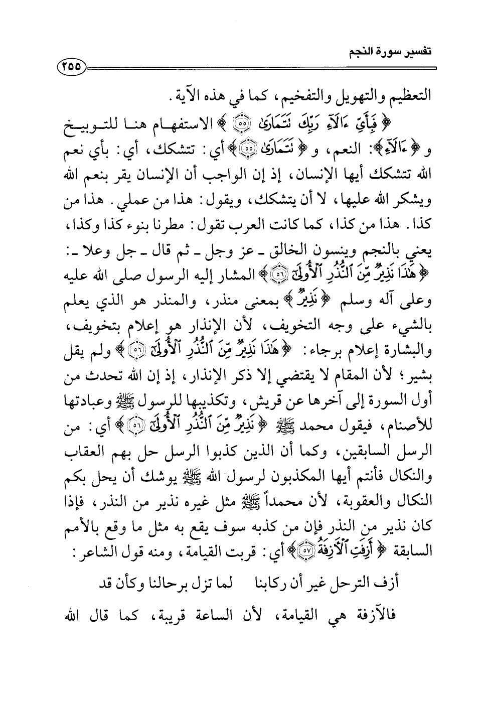 {فبأي آلاء ربك تتمارى} الاستفهام هنا للتوبيخ و {آلاء} : النعم، و {تتمارى} أي: تتشكك، أي: بأي نعم الله تتشكك أيها الإنسان، إذ إن الواجب أن الإنسان يقر بنعم الله ويشكر الله عليها، لا أن يتشكك، ويقول: هذا من عملي. هذا من كذا. هذا من كذا، كما كانت العرب تقول: مطرنا بنوء كذا وكذا، يعني بالنجم وينسون الخالق - عز وجل - ثم قال - جل وعلا -: {هذا نذير من النذر الأُولى} المشار إليه الرسول صلى الله عليه وعلى آله وسلم {نذير} بمعنى منذر، والمنذر هو الذي يعلم بالشيء على وجه التخويف، لأن الإنذار هو إعلام بتخويف، والبشارة إعلام برجاء: {هذا نذير من النذر الأُولى} ولم يقل بشير؛ لأن المقام لا يقتضي إلا ذكر الإنذار، إذ إن الله تحدث من أول السورة إلى آخرها عن قريش، وتكذيبها للرسول صلى الله عليه وسلم وعبادتها للأصنام، فيقول محمد صلى الله عليه وسلم {نذير من النذر الأُولى} أي: من الرسل السابقين، وكما أن الذين كذبوا الرسل حل بهم العقاب والنكال فأنتم أيها المكذبون لرسول الله صلى الله عليه وسلم يوشك أن يحل بكم النكال والعقوبة، لأن محمداً صلى الله عليه وسلم مثل غيره نذير من النذر، فإذا كان نذير من النذر فإن من كذبه سوف يقع به مثل ما وقع بالأمم السابقة {أزفت الآزفة} أي: قربت القيامة، ومنه قول الشاعر: