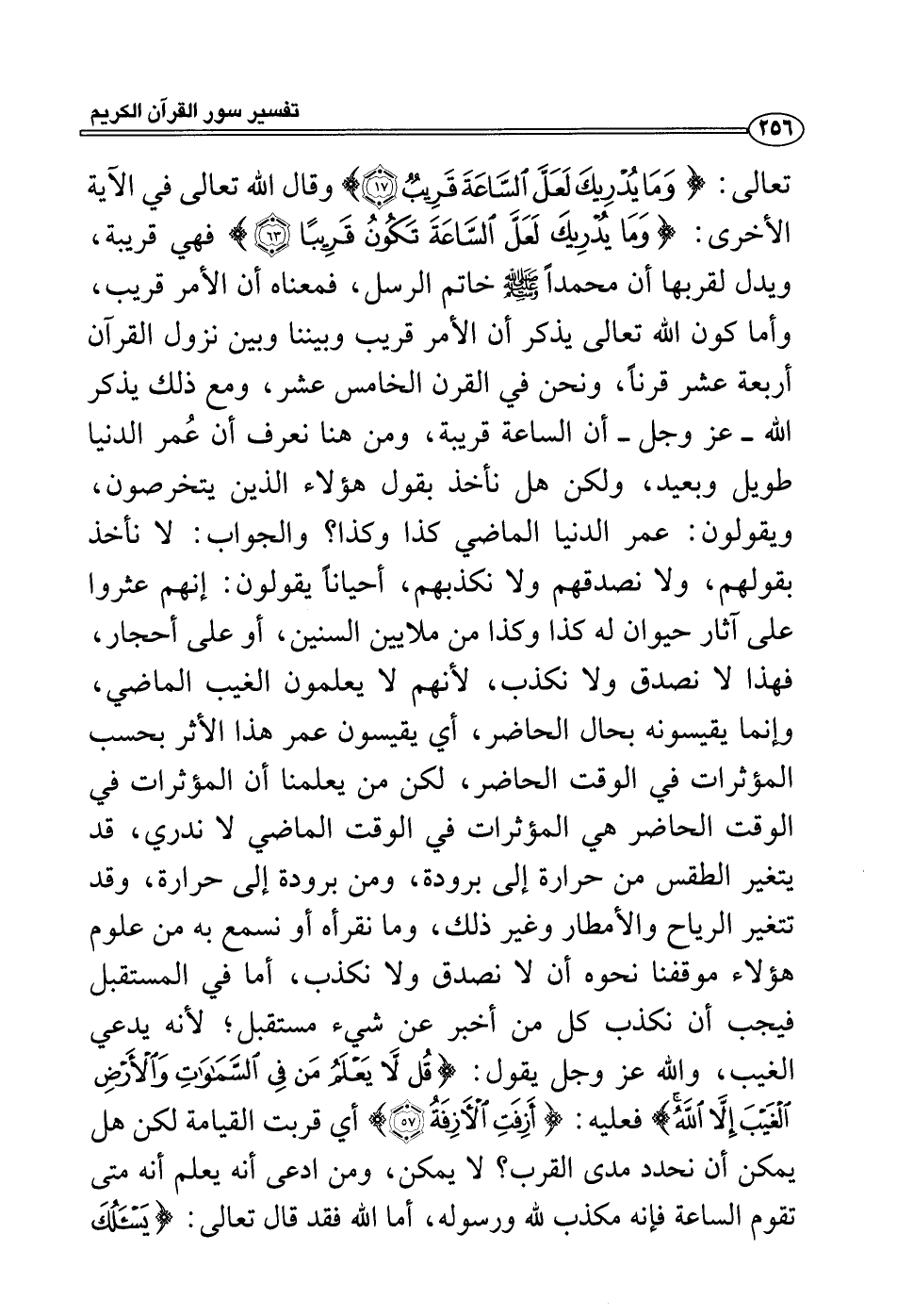 تعالى: {وما يدريك لعل الساعة قريب} وقال الله تعالى في الآية الأخرى: {وما يدريك لعل الساعة تكون قريباً} فهي قريبة، ويدل لقربها أن محمداً صلى الله عليه وسلم خاتم الرسل، فمعناه أن الأمر قريب، وأما كون الله تعالى يذكر أن الأمر قريب وبيننا وبين نزول القرآن أربعة عشر قرناً، ونحن في القرن الخامس عشر، ومع ذلك يذكر الله - عز وجل - أن الساعة قريبة، ومن هنا نعرف أن عُمر الدنيا طويل وبعيد، ولكن هل نأخذ بقول هؤلاء الذين يتخرصون، ويقولون: عمر الدنيا الماضي كذا وكذا؟ والجواب: لا نأخذ بقولهم، ولا نصدقهم ولا نكذبهم، أحياناً يقولون: إنهم عثروا على آثار حيوان له كذا وكذا من ملايين السنين، أو على أحجار، فهذا لا نصدق ولا نكذب، لأنهم لا يعلمون الغيب الماضي، وإنما يقيسونه بحال الحاضر، أي يقيسون عمر هذا الأثر بحسب المؤثرات في الوقت الحاضر، لكن من يعلمنا أن المؤثرات في الوقت الحاضر هي المؤثرات في الوقت الماضي لا ندري، قد يتغير الطقس من حرارة إلى برودة، ومن برودة إلى حرارة، وقد تتغير الرياح والأمطار وغير ذلك، وما نقرأه أو نسمع به من علوم هؤلاء موقفنا نحوه أن لا نصدق ولا نكذب، أما في المستقبل فيجب أن نكذب كل من أخبر عن شيء مستقبل؛ لأنه يدعي الغيب، والله عز وجل يقول: {قل لا يعلم من في السماوات والأَرض الغيب إلا الله} فعليه: {أزفت الآزفة} أي قربت القيامة لكن هل يمكن أن نحدد مدى القرب؟ لا يمكن، ومن ادعى أنه يعلم أنه متى تقوم الساعة فإنه مكذب لله ورسوله، أما الله فقد قال تعالى: {يسئلك