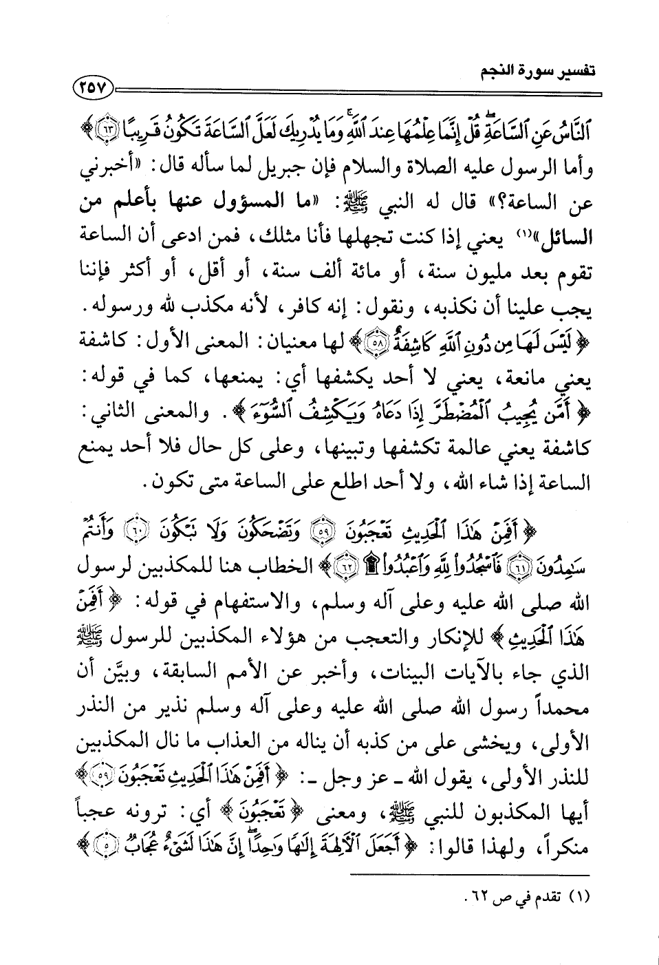 عليه وسلم: «ما المسؤول عنها بأعلم من السائل» (¬1) يعني إذا كنت تجهلها فأنا مثلك، فمن ادعى أن الساعة تقوم بعد مليون سنة، أو مائة ألف سنة، أو أقل، أو أكثر فإننا يجب علينا أن نكذبه، ونقول: إنه كافر، لأنه مكذب لله ورسوله. {ليس لها من دون الله كاشفة} لها معنيان: المعنى الأول: كاشفة يعني مانعة، يعني لا أحد يكشفها أي: يمنعها، كما في قوله: {أمن يجيب المضطر إذا دعاه ويكشف السوء} . والمعنى الثاني: كاشفة يعني عالمة تكشفها وتبينها، وعلى كل حال فلا أحد يمنع الساعة إذا شاء الله، ولا أحد اطلع على الساعة متى تكون.