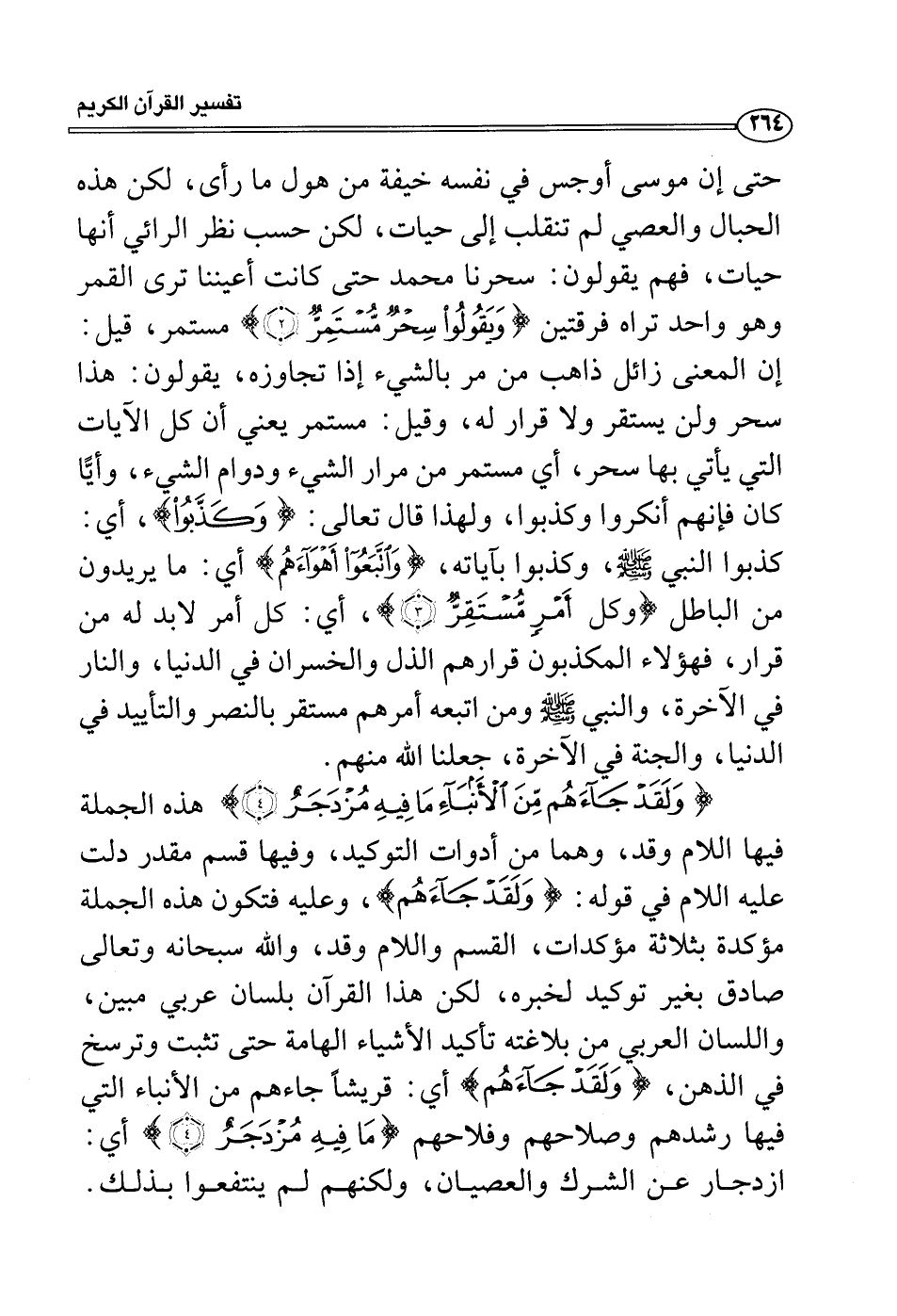 حتى إن موسى أوجس في نفسه خيفة من هول ما رأى، لكن هذه الحبال والعصي لم تنقلب إلى حيات، لكن حسب نظر الرائي أنها حيات، فهم يقولون: سحرنا محمد حتى كانت أعيننا ترى القمر وهو واحد تراه فرقتين {ويقولوا سحر مستمر} مستمر، قيل: إن المعنى زائل ذاهب من مر بالشيء إذا تجاوزه، يقولون: هذا سحر ولن يستقر ولا قرار له، وقيل: مستمر يعني أن كل الآيات التي يأتي بها سحر، أي مستمر من مرار الشيء ودوام الشيء، وأيًّا كان فإنهم أنكروا وكذبوا، ولهذا قال تعالى: {وكذبوا} ، أي: كذبوا النبي صلى الله عليه وسلم، وكذبوا بآياته، {واتبعوا أهواءهم} أي: ما يريدون من الباطل {وكل أمر مستقر} ، أي: كل أمر لابد له من قرار، فهؤلاء المكذبون قرارهم الذل والخسران في الدنيا، والنار في الآخرة، والنبي صلى الله عليه وسلم ومن اتبعه أمرهم مستقر بالنصر والتأييد في الدنيا، والجنة في الآخرة، جعلنا الله منهم.