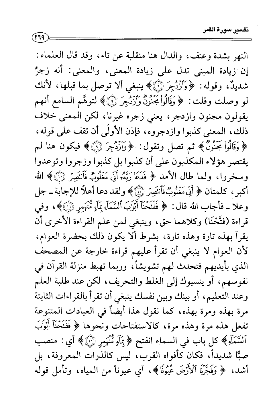 النهر بشدة وعنف، والدال هنا منقلبة عن تاء، وقد قال العلماء: إن زيادة المبنى تدل على زيادة المعنى، والمعنى: أنه زجرٌ شديدٌ، وقوله: {وازدجر} ينبغي ألا توصل بما قبلها، لأنك لو وصلت وقلت: {وقالوا مجنون وازدجر} لتوهَّم السامع أنهم يقولون مجنون وازدجر، يعني زجره غيرنا، لكن المعنى خلاف ذلك، المعنى كذبوا وازدجروه، فإذن الأولَى أن تقف على قوله، {وقالوا مجنون} ثم تصل وتقول: {وازدجر} فيكون هنا لم يقتصر هؤلاء المكذبون على أن كذبوا بل كذبوا وزجروا وتوعدوا وسخروا، ولما طال الأمد {فدعا ربه أني مغلوب فانتصر} الله أكبر، كلمتان {أني مغلوب فانتصر} ولقد دعا أهلاً للإجابة - جل وعلا - فأجاب الله قال: {ففتحنا أبواب السماء بماء منهمر} ، وفي قراءة (فتَّحْنَا) وكلاهما حق، وينبغي لمن علم القراءة الأخرى أن يقرأ بهذه تارة وهذه تارة، بشرط ألا يكون ذلك بحضرة العوام، لأن العوام لا ينبغي أن تقرأ عليهم قراءة خارجة عن المصحف الذي بأيديهم فتحدث لهم تشويشاً، وربما تهبط منزلة القرآن في نفوسهم، أو ينسبوك إلى الغلط والتحريف، لكن عند طلبة العلم وعند التعليم، أو بينك وبين نفسك ينبغي أن تقرأ بالقراءات الثابتة مرة بهذه ومرة بهذه، كما نقول هذا أيضاً في العبادات المتنوعة تفعل هذه مرة وهذه مرة، كالاستفتاحات ونحوها {ففتحنا أبواب السماء} كل باب في السماء انفتح {بماء منهمر} أي: منصب صبًّا شديداً، فكان كأفواه القرب، ليس كالذرات المعروفة، بل أشد، {وفجرنا الأَرض عيوناً} ، أي عيوناً من المياه، وتأمل قوله