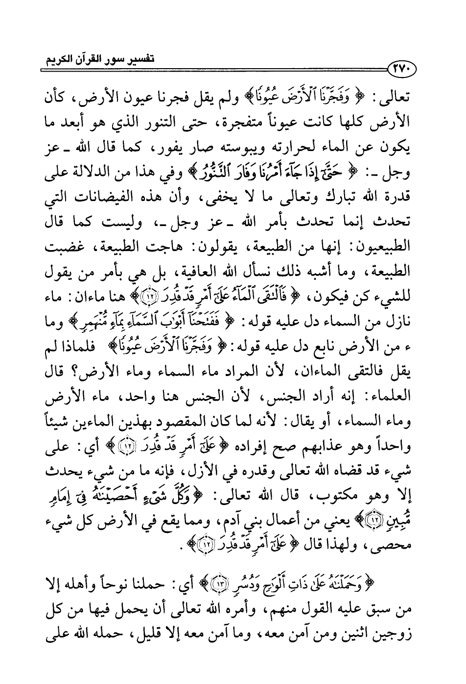 {حتى إذا جاء أمرنا وفار التنور} وفي هذا من الدلالة على قدرة الله تبارك وتعالى ما لا يخفى، وأن هذه الفيضانات التي تحدث إنما تحدث بأمر الله - عز وجل -، وليست كما قال الطبيعيون: إنها من الطبيعة، يقولون: هاجت الطبيعة، غضبت الطبيعة، وما أشبه ذلك نسأل الله العافية، بل هي بأمر من يقول للشيء كن فيكون، {فالتقى الماء على أمر قد قدر} هنا ماءان: ماء نازل من السماء دل عليه قوله: {ففتحنا أبواب السماء بماء منهمر} وماء من الأرض نابع دل عليه قوله: {وفجرنا الأَرض عيوناً} فلماذا لم يقل فالتقى الماءان، لأن المراد ماء السماء وماء الأرض؟ قال العلماء: إنه أراد الجنس، لأن الجنس هنا واحد، ماء الأرض وماء السماء، أو يقال: لأنه لما كان المقصود بهذين الماءين شيئاً واحداً وهو عذابهم صح إفراده {على أمر قد قدر} أي: على شيء قد قضاه الله تعالى وقدره في الأزل، فإنه ما من شيء يحدث إلا وهو مكتوب، قال الله تعالى: {وكل شيء أحصيناه في إمام مبين} يعني من أعمال بني آدم، ومما يقع في الأرض كل شيء محصى، ولهذا قال {على أمر قد قدر} .
