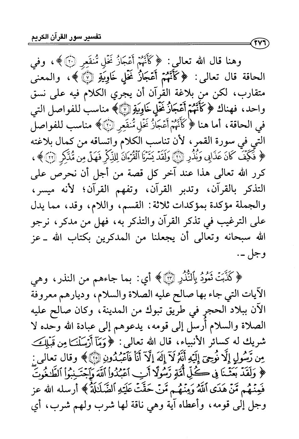 وهنا قال الله تعالى: {كأنهم أعجاز نخل منقعر} ، وفي الحاقة قال تعالى: {كأنهم أعجاز نخل خاوية} ، والمعنى متقارب، لكن من بلاغة القرآن أن يجري الكلام فيه على نسق واحد، فهناك {كأنهم أعجاز نخل خاوية} مناسب للفواصل التي في الحاقة، أما هنا {كأنهم أعجاز نخل منقعر} مناسب للفواصل التي في سورة القمر، لأن تناسب الكلام واتساقه من كمال بلاغته {فكيف كان عذابي ونذر ولقد يسرنا القرءان للذكر فهل من مدكر} ، كرر الله تعالى هذا عند آخر كل قصة من أجل أن نحرص على التذكر بالقرآن، وتدبر القرآن، وتفهم القرآن؛ لأنه ميسر، والجملة مؤكدة بمؤكدات ثلاثة: القسم، واللام، وقد، مما يدل على الترغيب في تذكر القرآن والتذكر به، فهل من مدكر، نرجو الله سبحانه وتعالى أن يجعلنا من المدكرين بكتاب الله - عز وجل -.