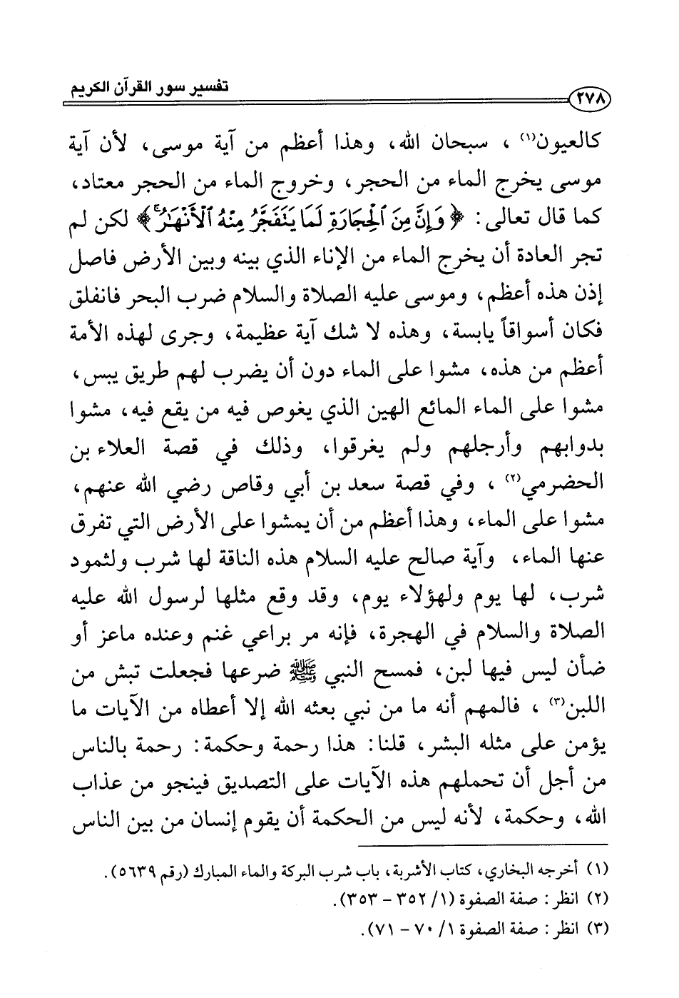 كالعيون (¬1) ، سبحان الله، وهذا أعظم من آية موسى، لأن آية موسى يخرج الماء من الحجر، وخروج الماء من الحجر معتاد، كما قال تعالى: {وإن من الحجارة لما يتفجر منه الأَنهار} لكن لم تجر العادة أن يخرج الماء من الإناء الذي بينه وبين الأرض فاصل إذن هذه أعظم، وموسى عليه الصلاة والسلام ضرب البحر فانفلق فكان أسواقاً يابسة، وهذه لا شك آية عظيمة، وجرى لهذه الأمة أعظم من هذه، مشوا على الماء دون أن يضرب لهم طريق يبس، مشوا على الماء المائع الهين الذي يغوص فيه من يقع فيه، مشوا بدوابهم وأرجلهم ولم يغرقوا، وذلك في قصة العلاء بن الحضرمي (¬2) ، وفي قصة سعد بن أبي وقاص رضي الله عنهم، مشوا على الماء، وهذا أعظم من أن يمشوا على الأرض التي تفرق عنها الماء، وآية صالح عليه السلام هذه الناقة لها شرب ولثمود شرب، لها يوم ولهؤلاء يوم، وقد وقع مثلها لرسول الله عليه الصلاة والسلام في الهجرة، فإنه مر براعي غنم وعنده ماعز أو ضأن ليس فيها لبن، فمسح النبي صلى الله عليه وسلم ضرعها فجعلت تبش من اللبن (¬3) ،