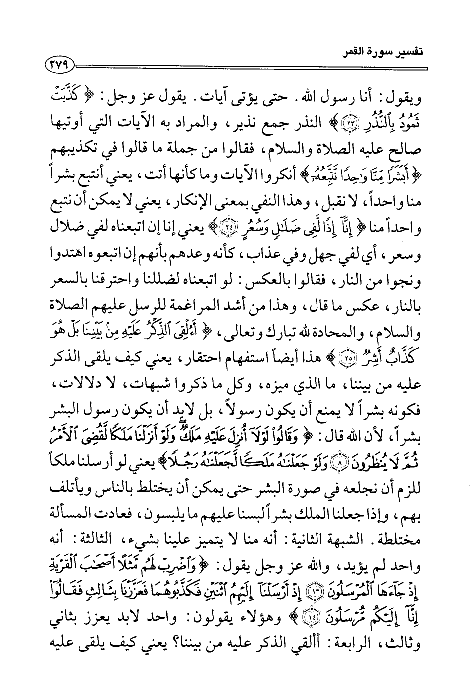 ويقول: أنا رسول الله. حتى يؤتى آيات. يقول عز وجل: {كذبت ثمود بالنذر} النذر جمع نذير، والمراد به الآيات التي أوتيها صالح عليه الصلاة والسلام، فقالوا من جملة ما قالوا في تكذيبهم {أبشراً منا واحداً نتبعه} أنكروا الآيات وما كأنها أتت، يعني أنتبع بشراً منا واحداً، لا نقبل، وهذا النفي بمعنى الإنكار، يعني لا يمكن أن نتبع واحداً منا {إنا إذاً لفي ضلال وسعر} يعني إنا إن اتبعناه لفي ضلال وسعر، أي لفي جهل وفي عذاب، كأنه وعدهم بأنهم إن اتبعوه اهتدوا ونجوا من النار، فقالوا بالعكس: لو اتبعناه لضللنا واحترقنا بالسعر بالنار، عكس ما قال، وهذا من أشد المراغمة للرسل عليهم الصلاة والسلام، والمحادة لله تبارك وتعالى، {أءلقى الذكر عليه من بيننا بل هو كذاب أشر} هذا أيضاً استفهام احتقار، يعني كيف يلقى الذكر عليه من بيننا، ما الذي ميزه، وكل ما ذكروا شبهات، لا دلالات، فكونه بشراً لا يمنع أن يكون رسولاً، بل لابد أن يكون رسول البشر بشراً، لأن الله قال: {وقالوا لولآ أنزل عليه ملك ولو أنزلنا ملكاً لقضى الأَمر ثم لا ينظرون ولو جعلناه ملكاً لجعلناه رجلاً} يعني لو أرسلنا ملكاً للزم أن نجلعه في صورة البشر حتى يمكن أن يختلط بالناس ويأتلف بهم، وإذا جعلنا الملك بشراً لبسنا عليهم ما يلبسون، فعادت المسألة مختلطة.