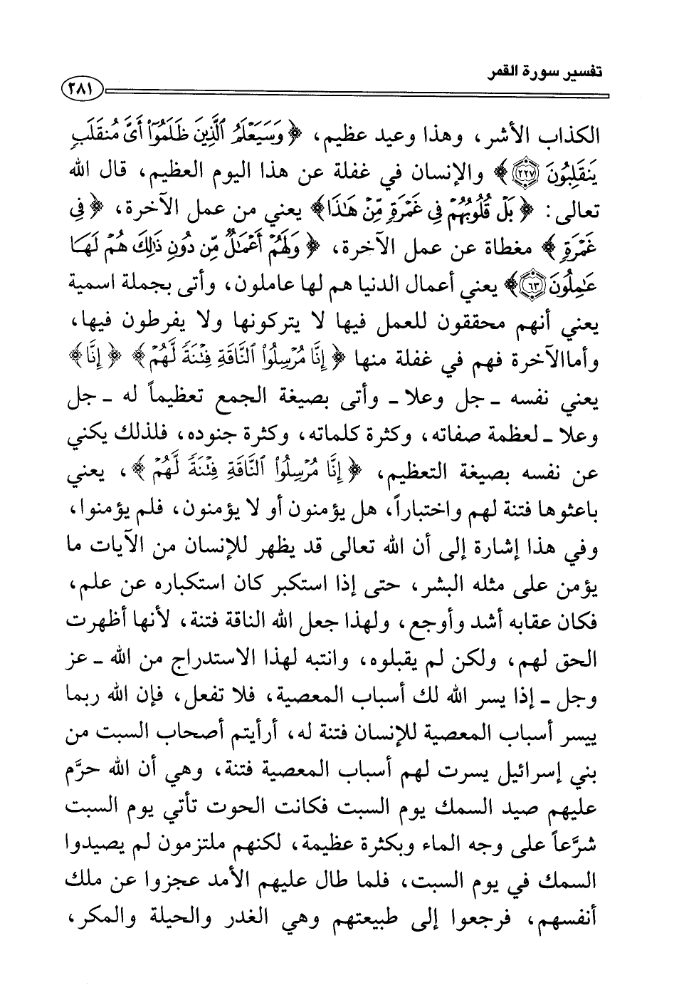 الكذاب الأشر، وهذا وعيد عظيم، {وسيعلم الذين ظلموا أي منقلب ينقلبون} والإنسان في غفلة عن هذا اليوم العظيم، قال الله تعالى: {بل قلوبهم في غمرة من هذا} يعني من عمل الآخرة، {في غمرة} مغطاة عن عمل الآخرة، {ولهم أعمال من دون ذلك هم لها عاملون} يعني أعمال الدنيا هم لها عاملون، وأتى بجملة اسمية يعني أنهم محققون للعمل فيها لا يتركونها ولا يفرطون فيها، وأما الآخرة فهم في غفلة منها {إنا مرسلوا الناقة فتنةً لهم} {إنا} يعني نفسه - جل وعلا - وأتى بصيغة الجمع تعظيماً له - جل وعلا - لعظمة صفاته، وكثرة كلماته، وكثرة جنوده، فلذلك يكني عن نفسه بصيغة التعظيم، {إنا مرسلوا الناقة فتنةً لهم} ، يعني باعثوها فتنة لهم واختباراً، هل يؤمنون أو لا يؤمنون، فلم يؤمنوا، وفي هذا إشارة إلى أن الله تعالى قد يظهر للإنسان من الآيات ما يؤمن على مثله البشر، حتى إذا استكبر كان استكباره عن علم، فكان عقابه أشد وأوجع، ولهذا جعل الله الناقة فتنة، لأنها أظهرت الحق لهم، ولكن لم يقبلوه، وانتبه لهذا الاستدراج من الله - عز وجل - إذا يسر الله لك أسباب المعصية، فلا تفعل، فإن الله ربما ييسر أسباب المعصية للإنسان فتنة له، أرأيتم أصحاب السبت من بني إسرائيل يسرت لهم أسباب المعصية فتنة، وهي أن الله حرَّم عليهم صيد السمك يوم السبت فكانت الحوت تأتي يوم السبت شرَّعاً على وجه الماء وبكثرة عظيمة، لكنهم ملتزمون لم يصيدوا السمك في يوم السبت، فلما طال عليهم الأمد عجزوا عن ملك أنفسهم، فرجعوا إلى طبيعتهم وهي الغدر والحيلة والمكر،