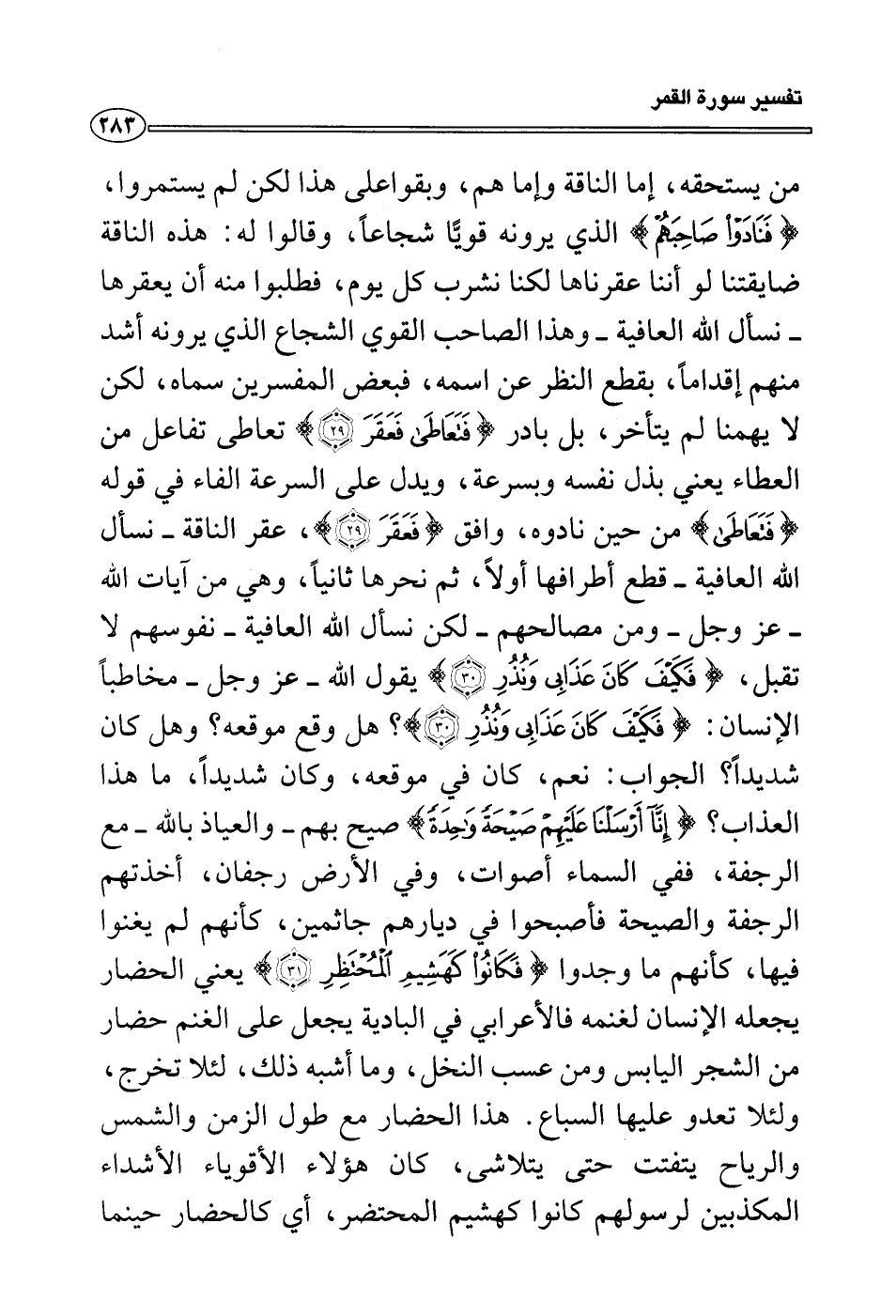من يستحقه، إما الناقة وإما هم، وبقوا على هذا لكن لم يستمروا، {فنادوا صحبهم} الذي يرونه قويًّا شجاعاً، وقالوا له: هذه الناقة ضايقتنا لو أننا عقرناها لكنا نشرب كل يوم، فطلبوا منه أن يعقرها - نسأل الله العافية - وهذا الصاحب القوي الشجاع الذي يرونه أشد منهم إقداماً، بقطع النظر عن اسمه، فبعض المفسرين سماه، لكن لا يهمنا لم يتأخر، بل بادر {فتعاطى فعقر} تعاطى تفاعل من العطاء يعني بذل نفسه وبسرعة، ويدل على السرعة الفاء في قوله {فتعاطى} من حين نادوه، وافق {فعقر} ، عقر الناقة - نسأل الله العافية - قطع أطرافها أولاً، ثم نحرها ثانياً، وهي من آيات الله - عز وجل - ومن مصالحهم - لكن نسأل الله العافية - نفوسهم لا تقبل، {فكيف كان عذابي ونذر} يقول الله - عز وجل - مخاطباً الإنسان: {فكيف كان عذابي ونذر} ؟ هل وقع موقعه؟ وهل كان شديداً؟ الجواب: نعم، كان في موقعه، وكان شديداً، ما هذا العذاب؟ {إنا أرسلنا عليهم صيحةً واحدة فكانوا كهشيم المحتظر} صيح بهم - والعياذ بالله - مع الرجفة، ففي السماء أصوات، وفي الأرض رجفان، أخذتهم الرجفة والصيحة فأصبحوا في ديارهم جاثمين، كأنهم لم يغنوا فيها، كأنهم ما وجدوا {فكانوا كهشيم المحتظر} يعني الحضار يجعله