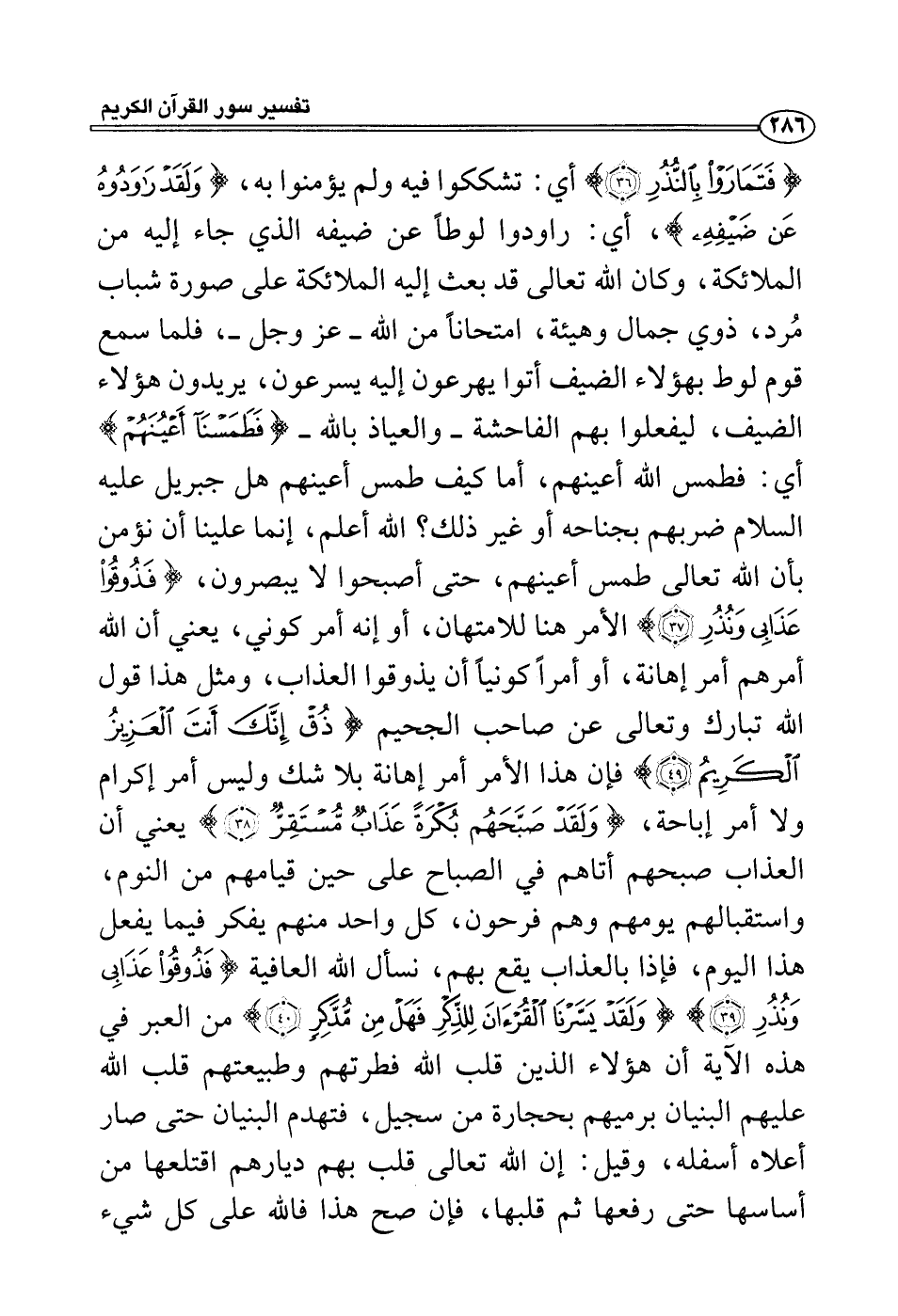 {فتماروا بالنذر} أي: تشككوا فيه ولم يؤمنوا به، {ولقد راودوه عن ضيفه} ، أي: راودوا لوطاً عن ضيفه الذي جاء إليه من الملائكة، وكان الله تعالى قد بعث إليه الملائكة على صورة شباب مُرد، ذوي جمال وهيئة، امتحاناً من الله - عز وجل -، فلما سمع قوم لوط بهؤلاء الضيف أتوا يهرعون إليه يسرعون، يريدون هؤلاء الضيف، ليفعلوا بهم الفاحشة - والعياذ بالله - {فطمسنا أعينهم} أي: فطمس الله أعينهم، أما كيف طمس أعينهم هل جبريل عليه السلام ضربهم بجناحه أو غير ذلك؟ الله أعلم، إنما علينا أن نؤمن بأن الله تعالى طمس أعينهم، حتى أصبحوا لا يبصرون، {فذوقوا عذابي ونذر} الأمر هنا للامتهان، أو إنه أمر كوني، يعني أن الله أمرهم أمر إهانة، أو أمراً كونياً أن يذوقوا العذاب، ومثل هذا قول الله تبارك وتعالى عن صاحب الجحيم {ذق إنك أنت العزيز الكريم} فإن هذا الأمر أمر إهانة بلا شك وليس أمر إكرام ولا أمر إباحة، {ولقد صبحهم بكرةً عذاب