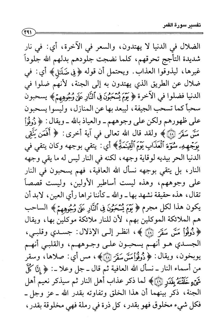 ويحتمل أن قوله {في ضلال} أي: في ضلال عن الطريق الذي يهتدون به إلى الجنة، لأنهم ضلوا في الدنيا فضلوا في الآخرة {يوم يسحبون في النار على وجوههم} يسحبون سحباً كما تسحب الجيفة، ليبعد بها عن المنازل، وليسوا يسحبون على ظهورهم ولكن على وجوههم - والعياذ بالله - ويقال: {ذوقوا مس سقر} ولقد قال الله تعالى في آية أخرى: {أفمن يتقي بوجهه سوء العذاب يوم القيامة} أي: يتقي بوجهه وكان يتقي في الدنيا الحر بيديه لوقاية وجهه، لكنه في النار ليس له ما يقي وجهه النار، بل يتقي بوجهه نسأل الله العافية، فهم يسحبون في النار على وجوههم، وهذه ليست أساطير الأولين، وليست قصصاً تقال، هذه حقيقة نشهد بها - والله - كأننا نراها رأي العين، لابد أن يكون هذا لكل مجرم {يوم يسحبون في النار على وجوههم} الساحب هم الملائكة الموكلين بهم، لأن للنار ملائكة موكلين بها، ويقال {ذوقوا مس سقر} ، انظر إلى الإذلال: جسدي وقلبي، الجسدي هو أنهم يسحبون على وجوههم، والقلبي أنهم يوبخون، ويقال: {ذوقوا مس سقر} ، مس أي: صلاها، وسقر من أسماء النار - نسأل الله العافية ثم قال - جل وعلا -: {إنا كل شيء خلقناه بقدر} لما ذكر عذاب أهل النار ثم سيذكر نعيم أهل الجنة، ذكر بينهما أن هذا الخلق وتفاوته بقدر الله - عز وجل - فكل شيء مخلوق فهو بقدر، كل ذرة في رملة فهي مخلوقة بقدر،